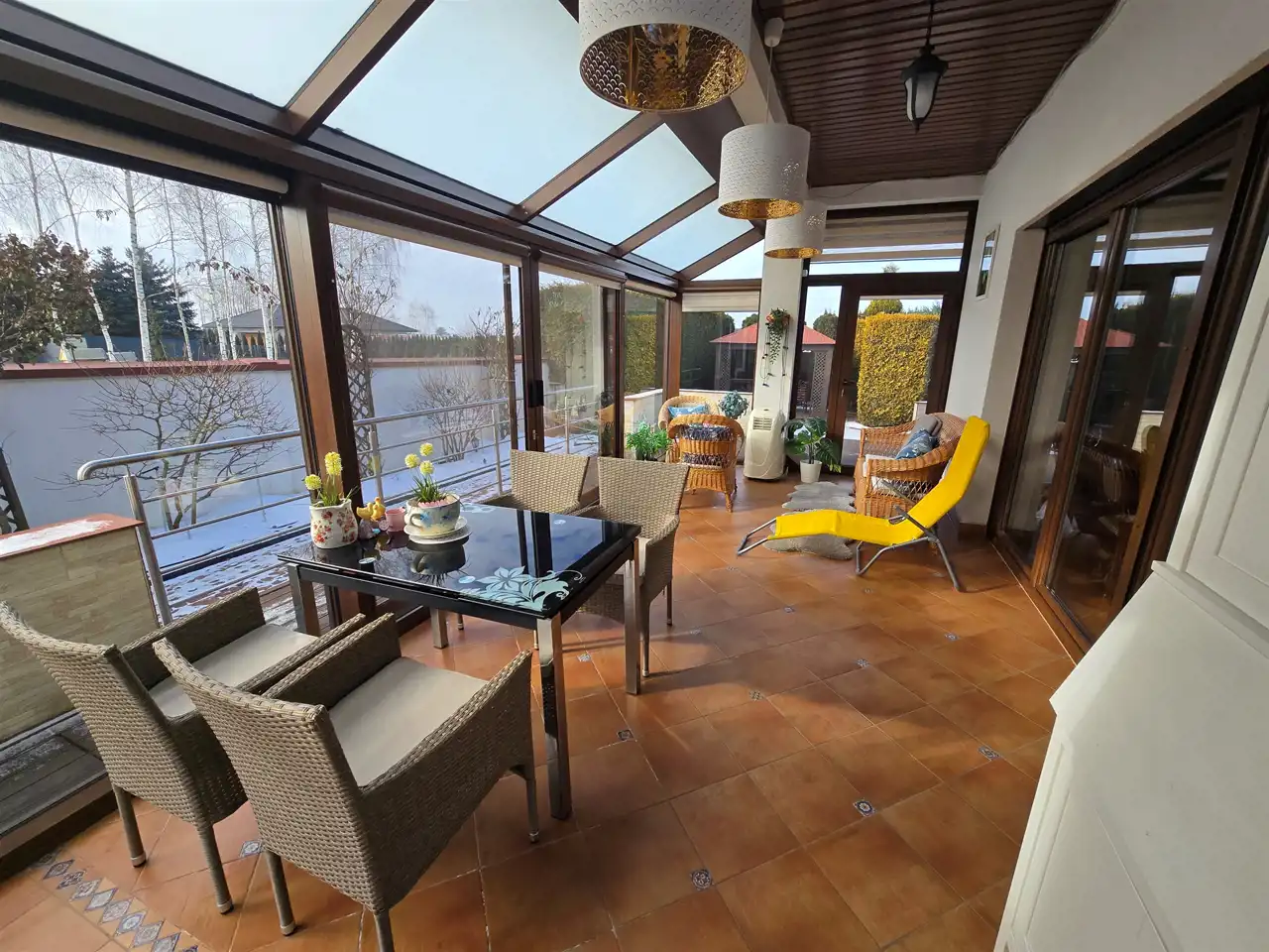 Duży, otwarty salon posiada bezpośrednie wyjście na piękny ogród zimowy.