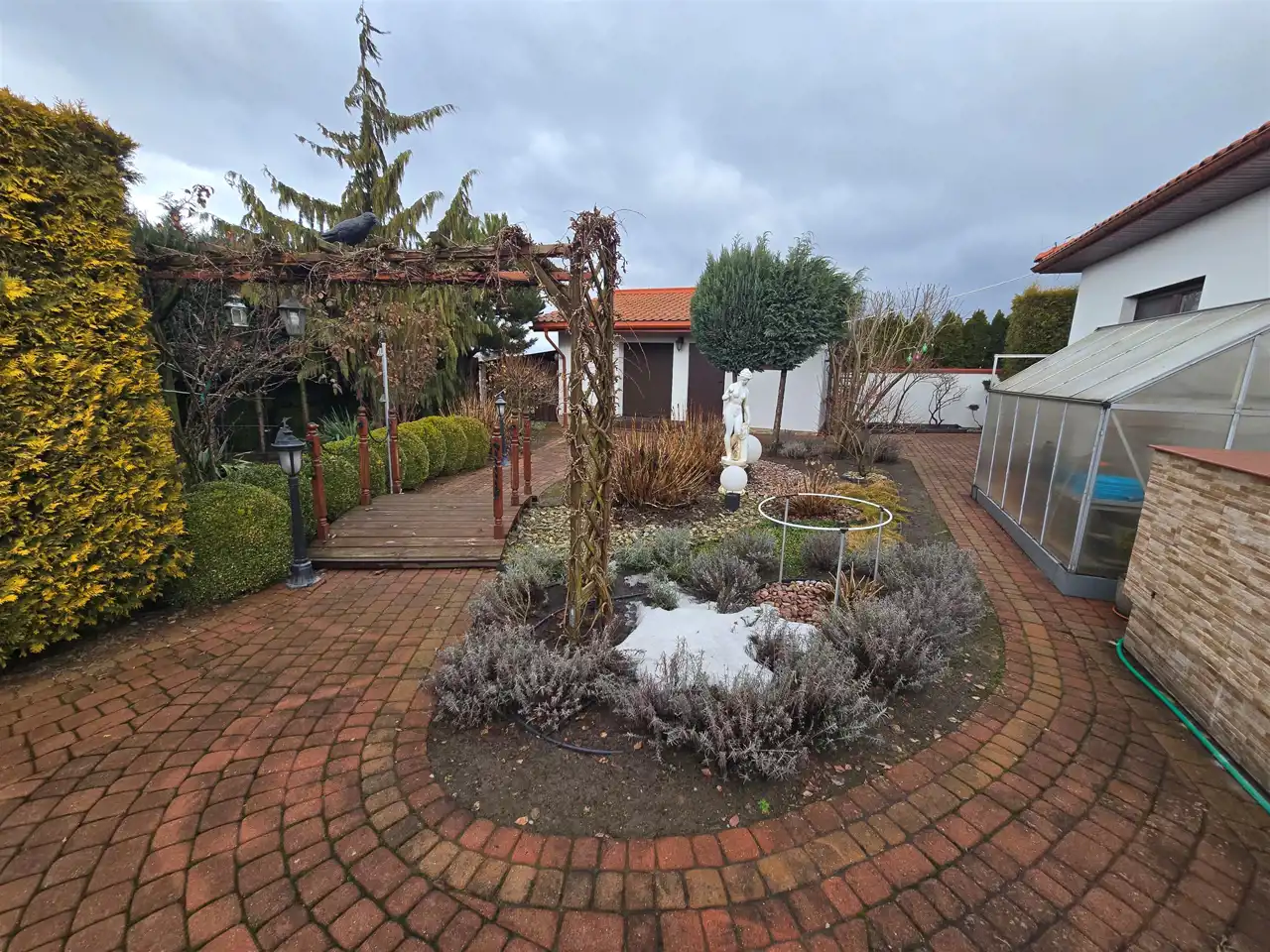 Dom usytuowany jest na pięknej, zagospodarowanej działce o powierzchni 1011m2.