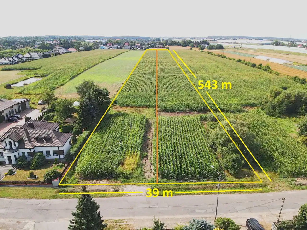Nieruchomość w kształcie prostokąta o wymiarach : 39 m szerokość x 543 m długość.