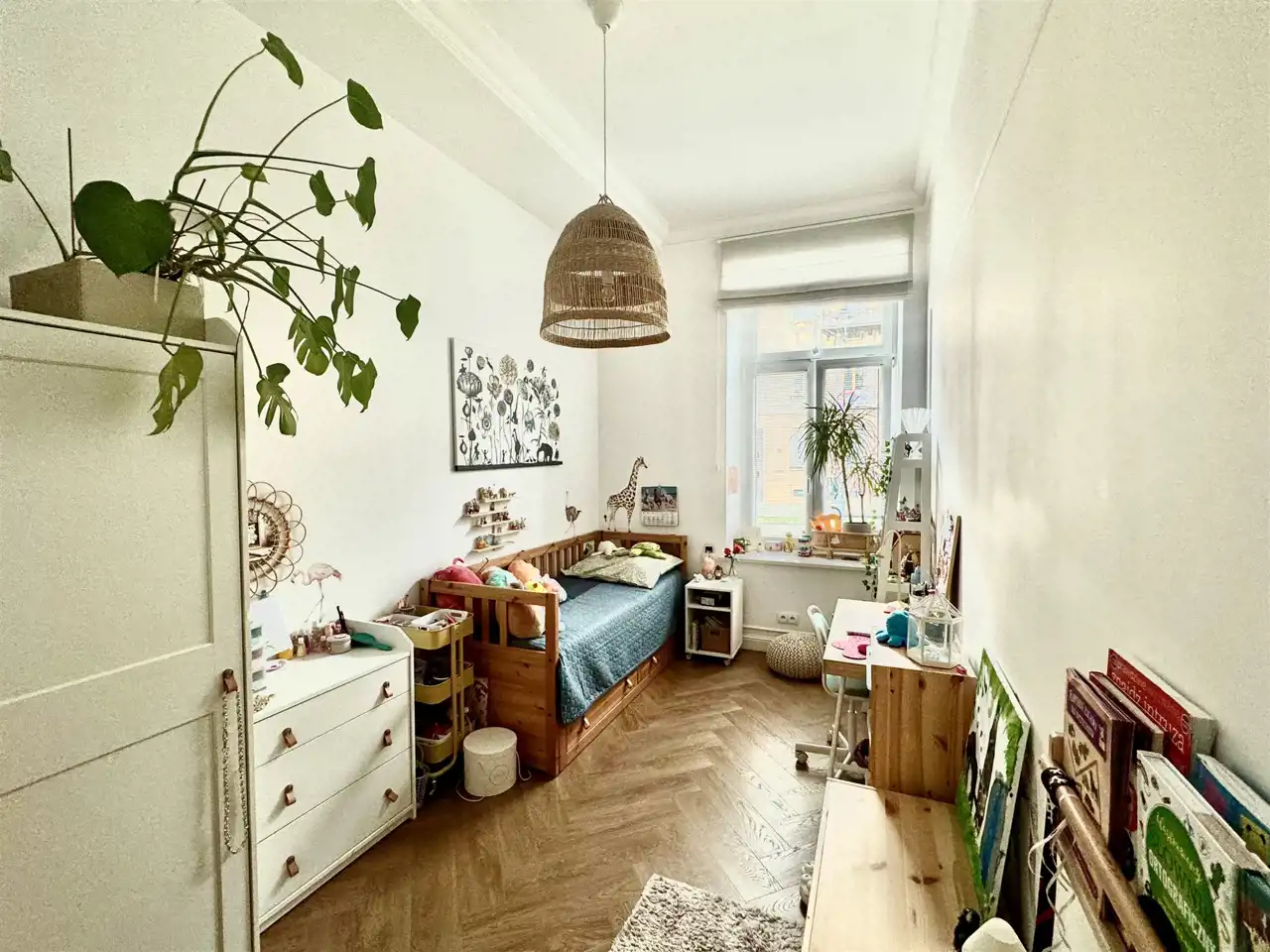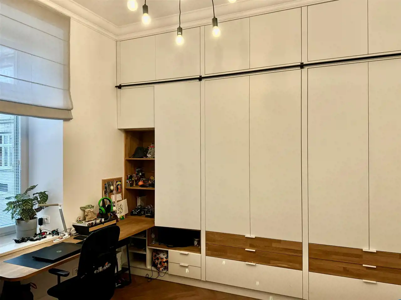 - w największym pomieszczeniu (biuro/sypialnia): meble na wymiar z biurkiem z dębowego blatu,
