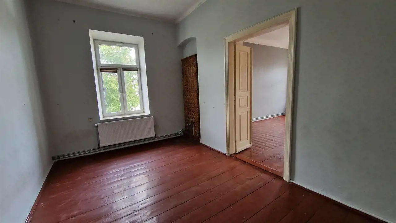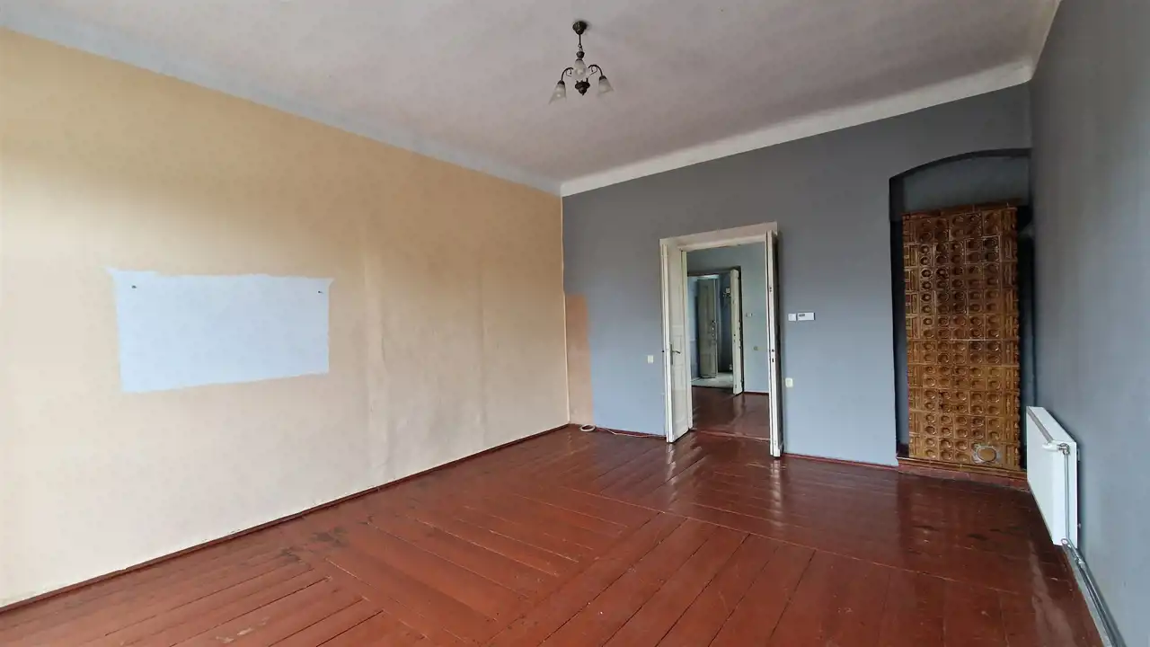 Okna PCV, ściany i sufit tynk cementowo-wapienny, podłogi deski, ogrzewanie gazowe kocioł gazowy dwufunkcyjny Junkers. Mieszkanie do remontu. Lokalizacja przy al. 3 Maja 3.
