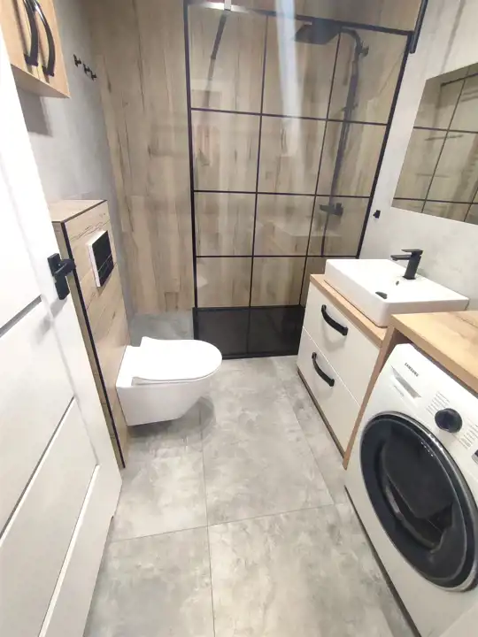 W łazience jest gustowna glazura, na podłodze gres na wyposażeniu pralka