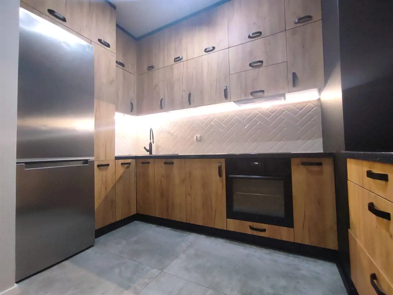 W efektownie zaprojektowanej zabudowie kuchennej znajduje się sprzęt AGD (zmywarka, wysoka lodówka z zamrażalką, piekarnik, płyta indukcyjna), okap. Na wyposażeniu klimatyzacja