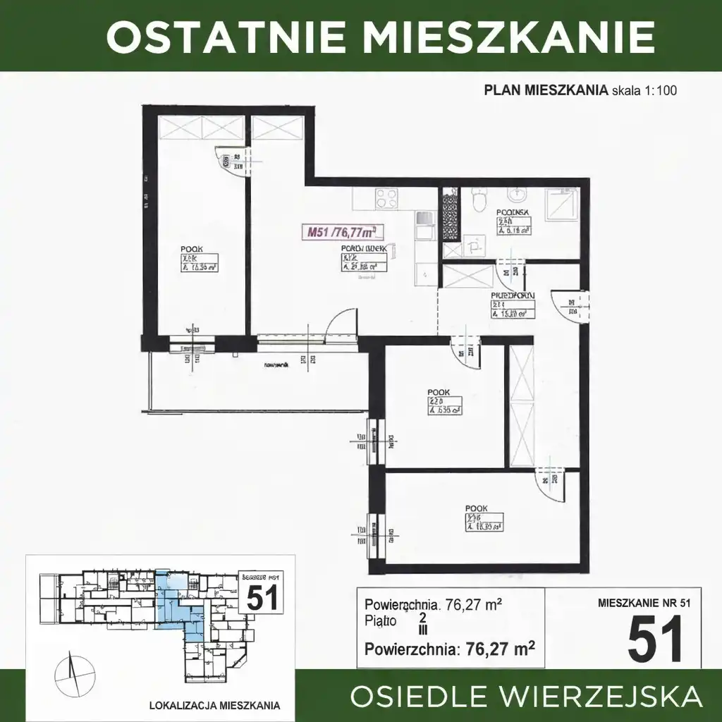 - Charakterystyka mieszkania 76.77 m2, 3 pokoje