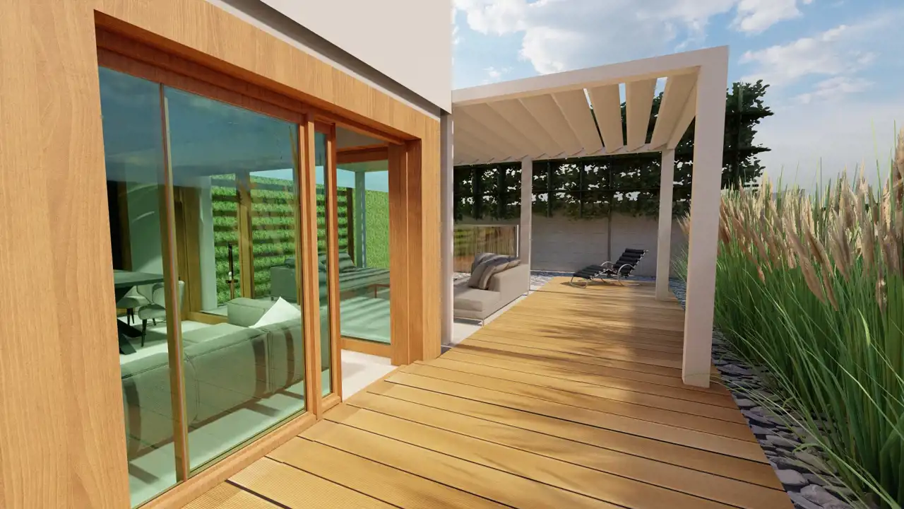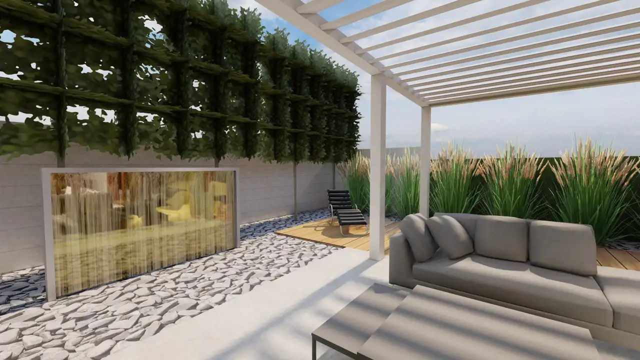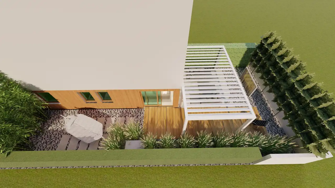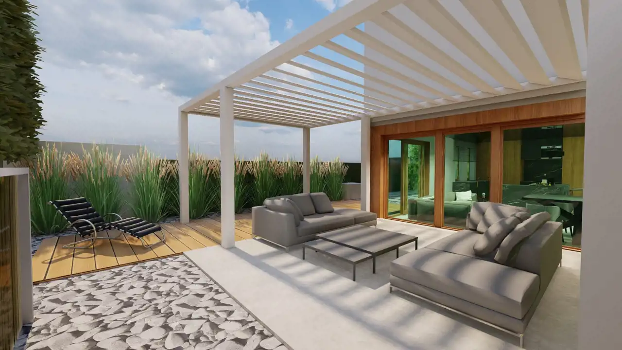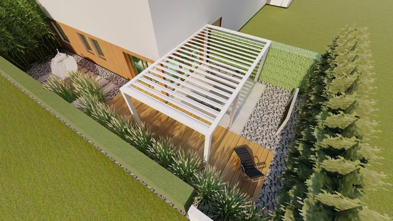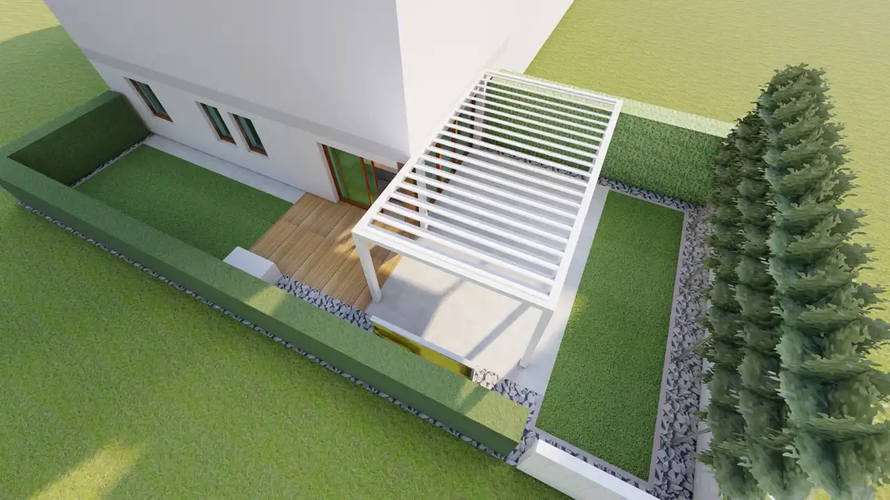 Dla lokalu został zaprojektowany taras zadaszony z ogrodem.