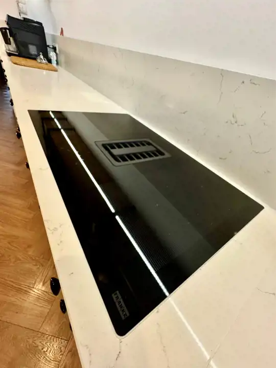 W kuchni zastosowano kamienne blaty, młynek w zlewie oraz meble na wymiar.