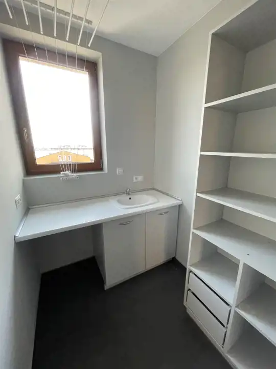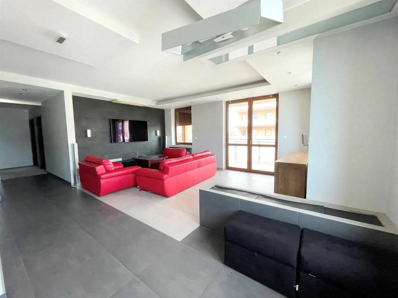 Układ funkcjonalny obejmuje : duży salon z funkcjonalną kuchnią, trzy pokoje, pomieszczenie gospodarcze, łazienkę, osobne WC, przedpokój oraz duży szeroki taras.