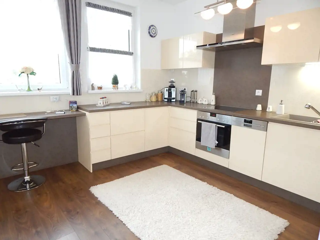 Na wyposażeniu pozostaje zabudowa kuchenna z wysokiej klasy sprzętem AGD. W łazience pralka. pozostałe meble mogą pozostać na życzenie kupującego.