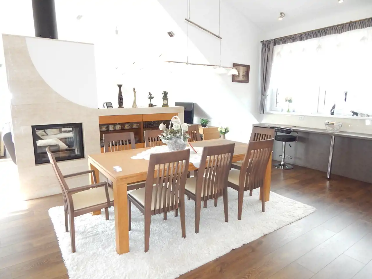 Niespotykane połączenie jadalni z salonem - pośrodku klimatyczny dwu stronny kominek.