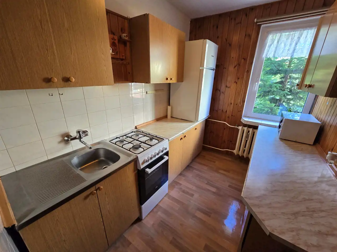 Kuchnia wyposażona - nowa kuchnia gazowa z piekarnikiem, lodówka.