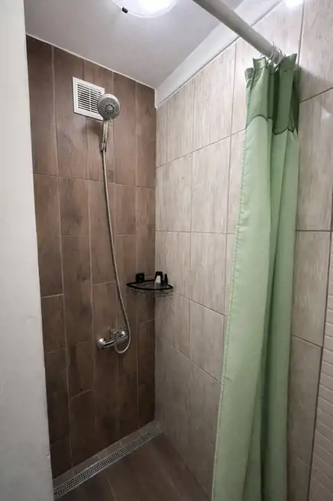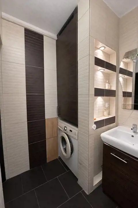 • łazienka z kabiną prysznicową i miejscem na pralkę