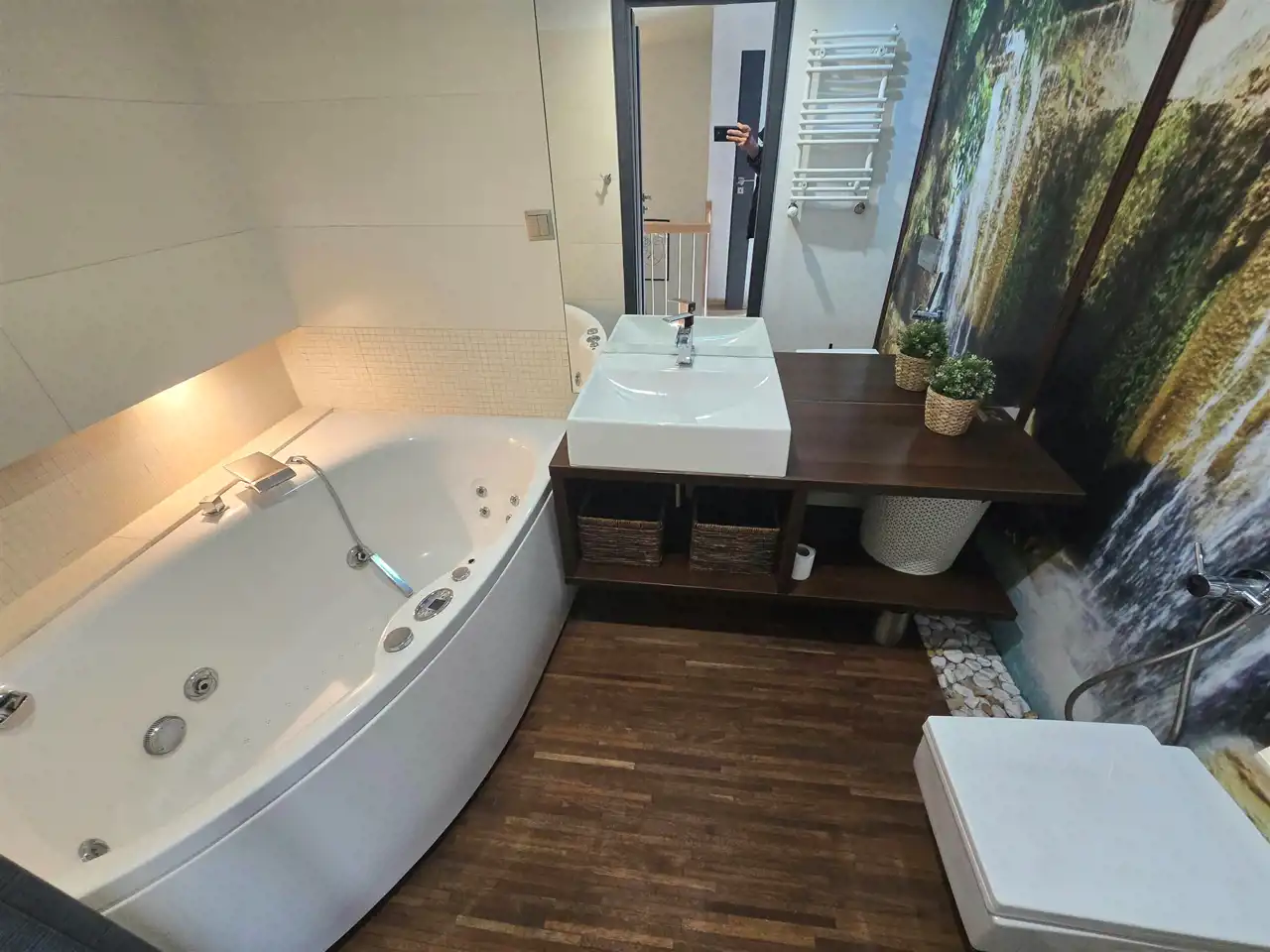 Druga łazienka: Pokój kąpielowy z dużą wanną z hydromasażem – Twoje prywatne SPA w domowym zaciszu.