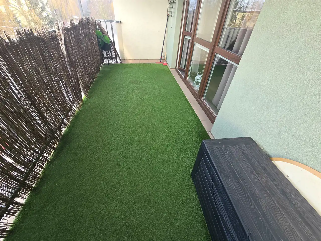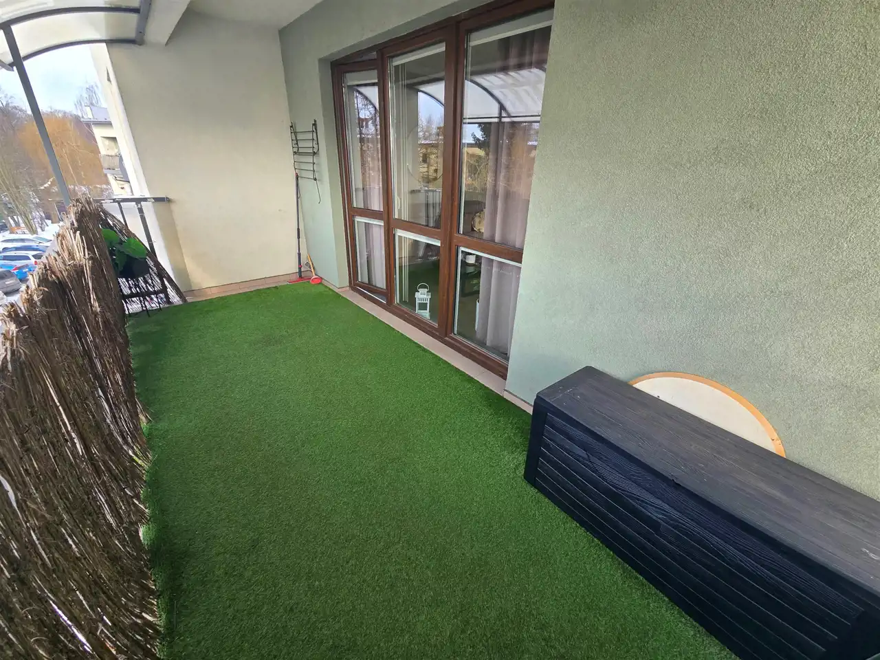 Przestronny salon: Jasny i ustawny, z bezpośrednim wyjściem na balkon wyłożony estetyczną sztuczną trawą – idealne miejsce na poranną kawę.