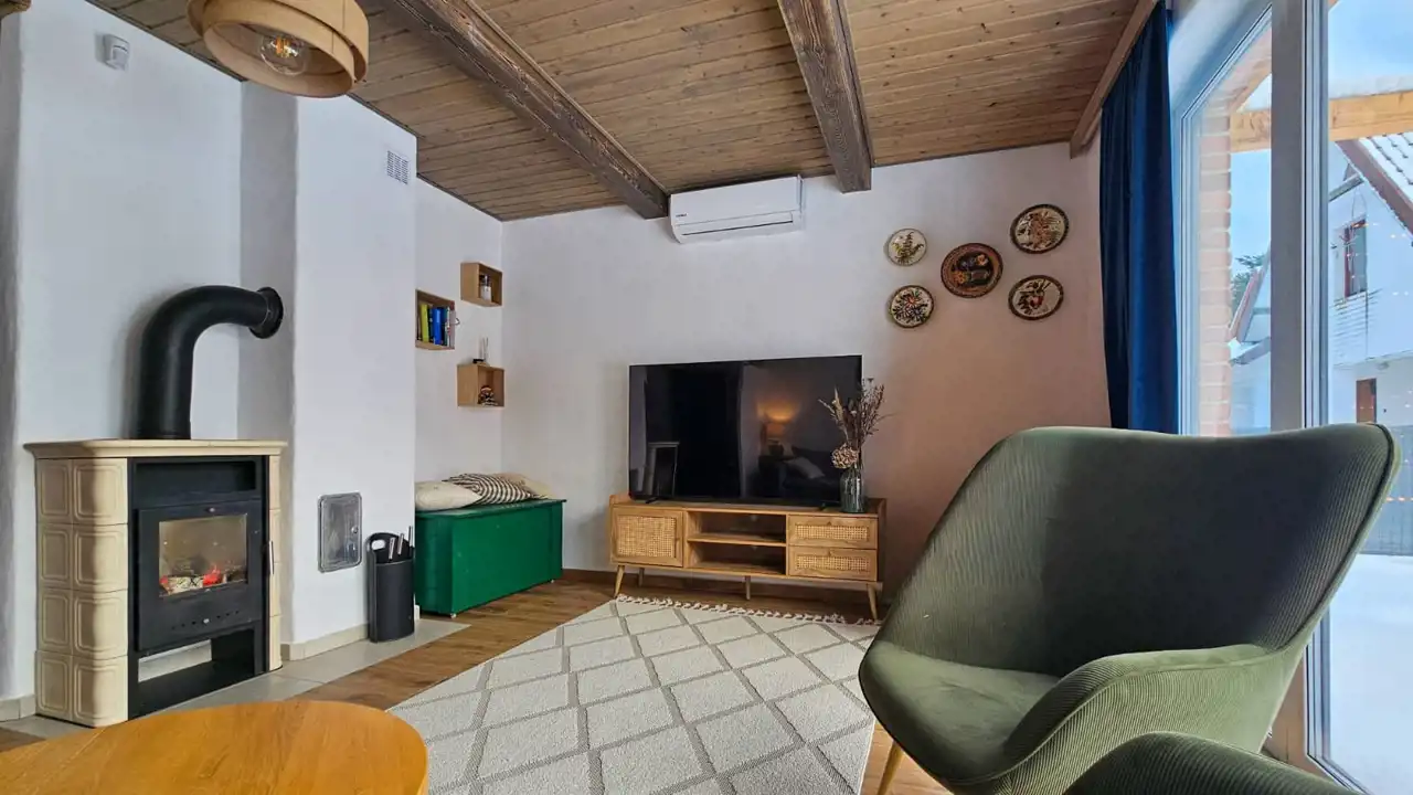Salon z kozą obłożoną kaflami i wyjściem na duży taras