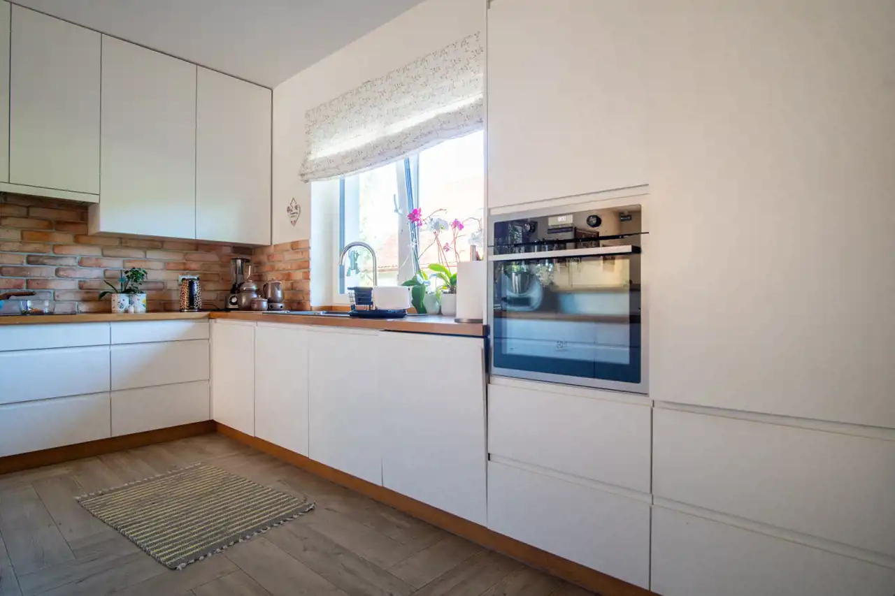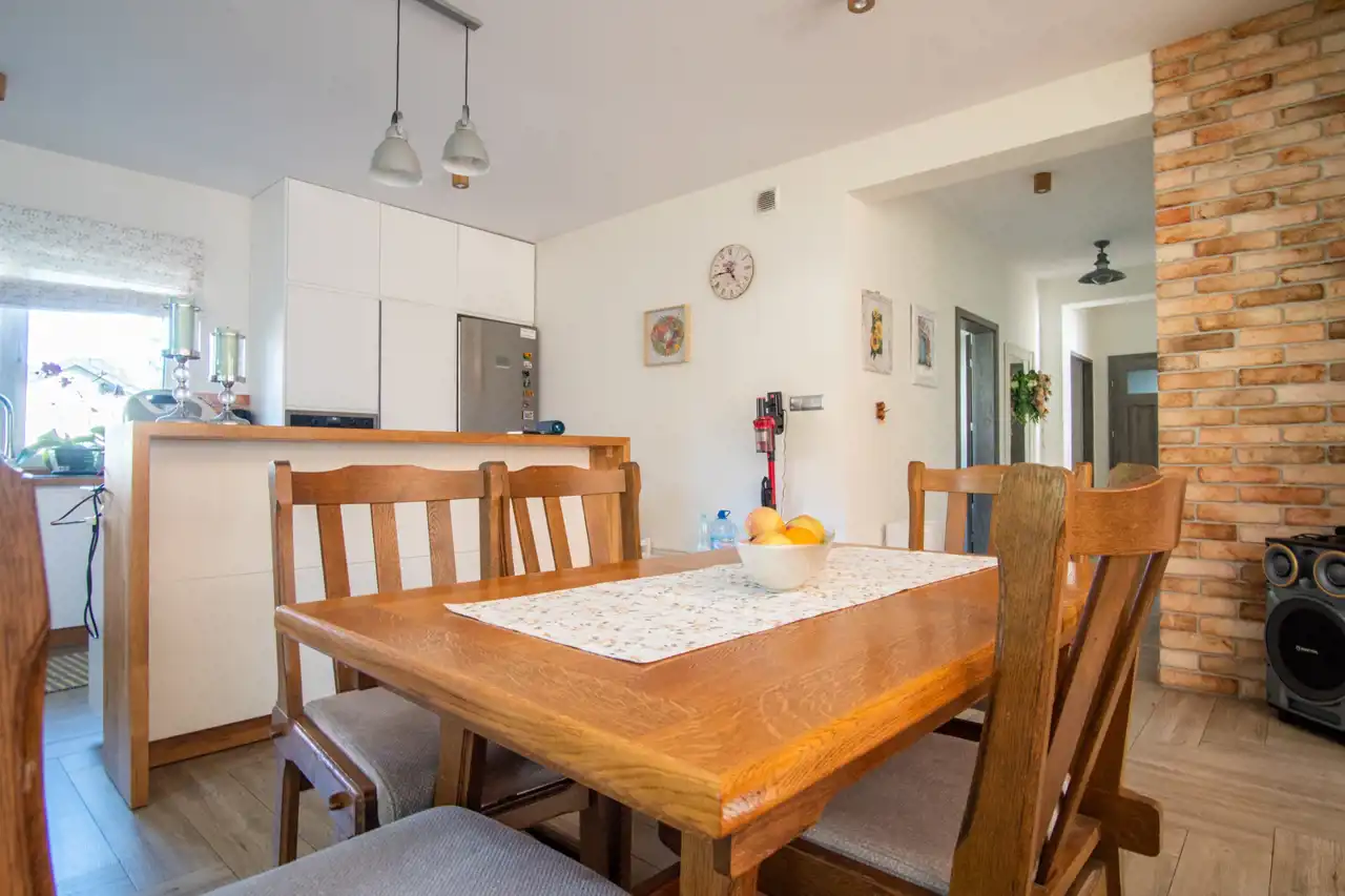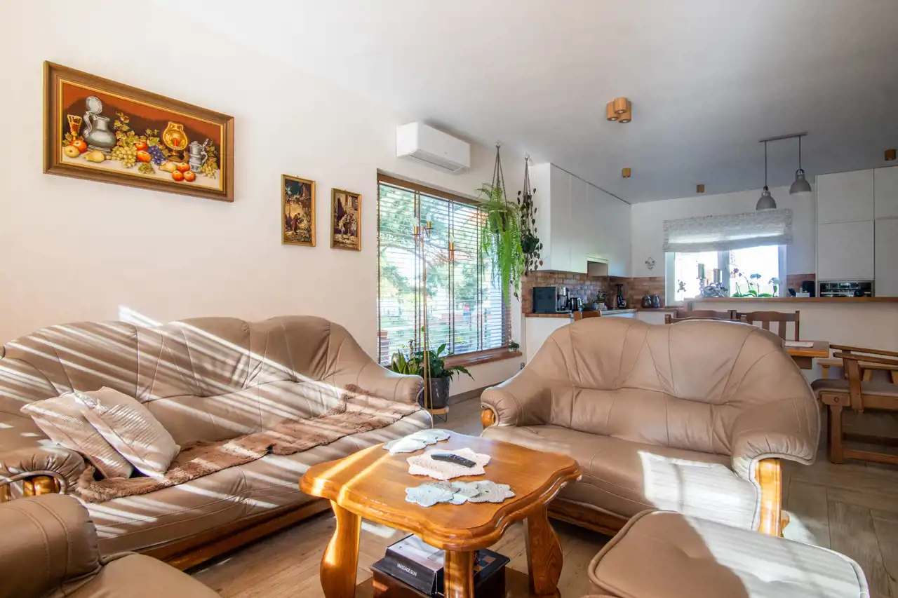 Wnętrze domu zostało zaprojektowane z myślą o funkcjonalności i komforcie. Przestronna, jasna kuchnia połączona jest z salonem tworząc otwartą, domową strefę dzienną. Do dyspozycji są 3 pokoje oraz 3 łazienki, co sprawia, że dom doskonale sprawdzi się dla rodziny, jak i osób ceniących przestrzeń.
