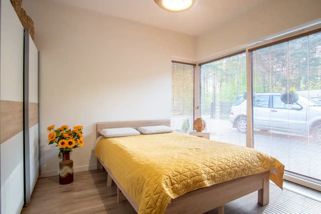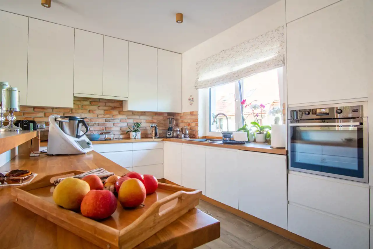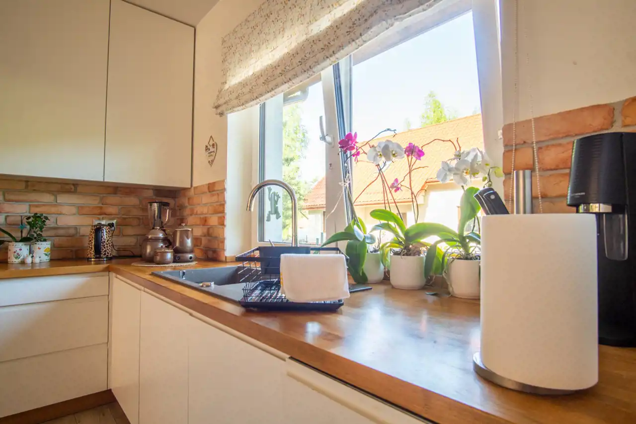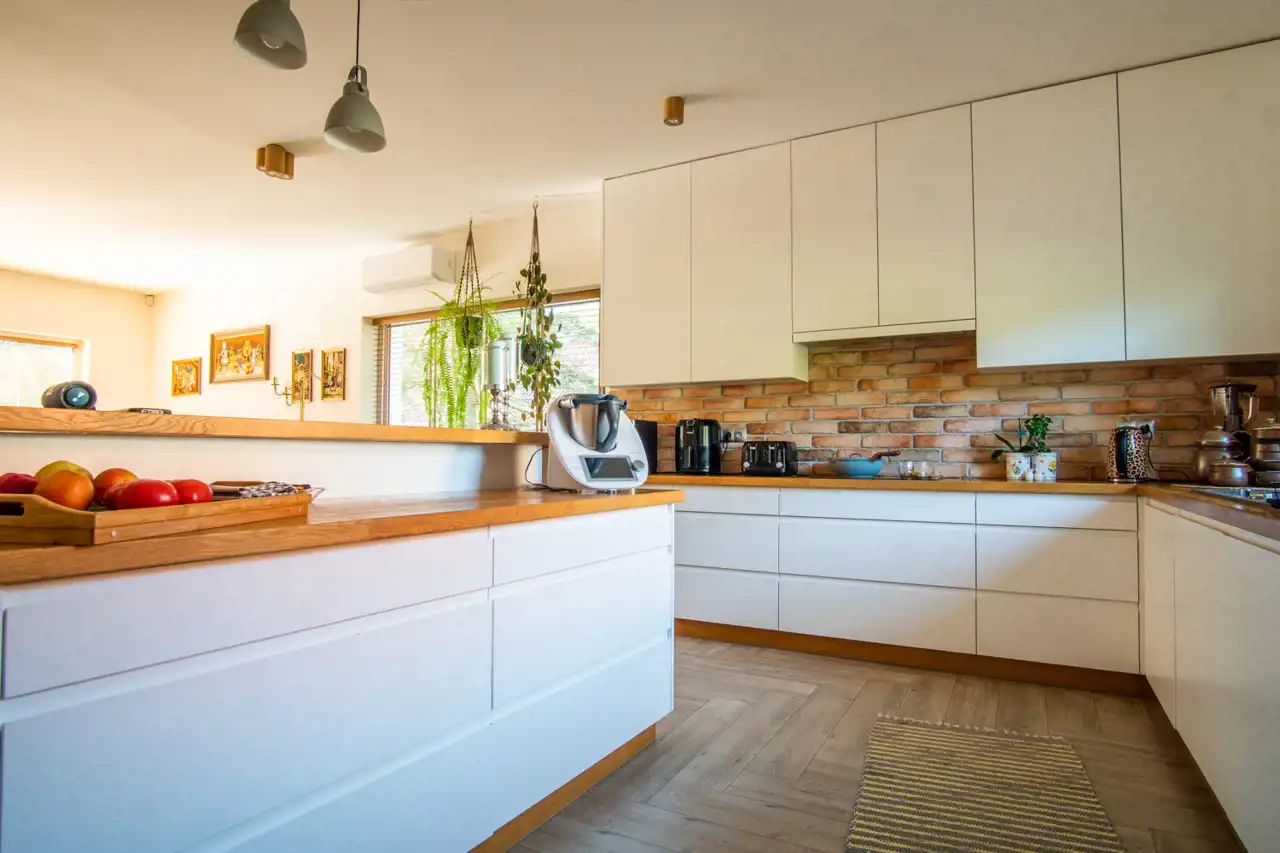 Wnętrze domu zostało zaprojektowane z myślą o funkcjonalności i komforcie. Przestronna, jasna kuchnia połączona jest z salonem tworząc otwartą, domową strefę dzienną. Do dyspozycji są 3 pokoje oraz 3 łazienki, co sprawia, że dom doskonale sprawdzi się dla rodziny, jak i osób ceniących przestrzeń.