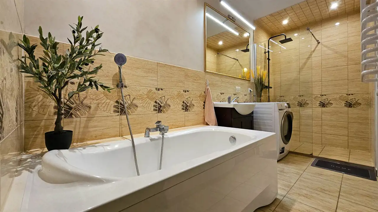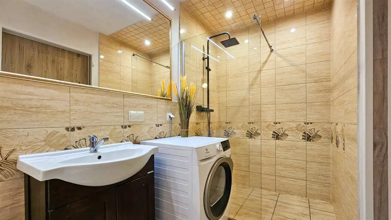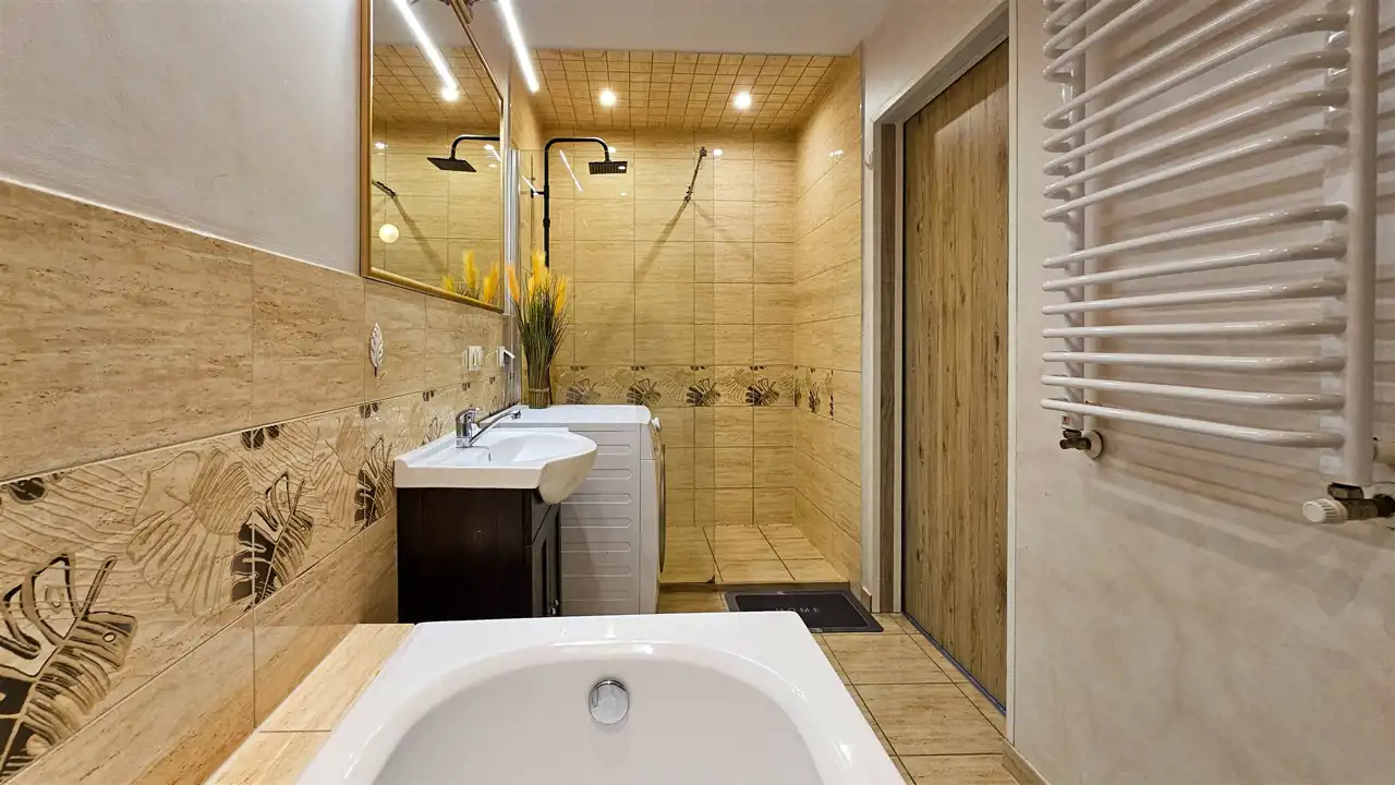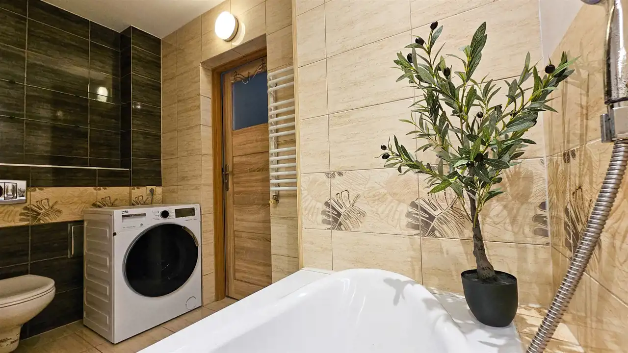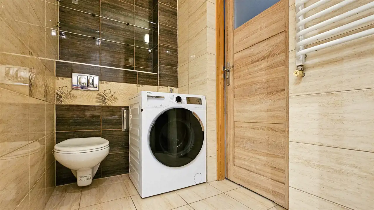 2 łazienki, sypialnie oraz pomieszczenia gospodarcze.