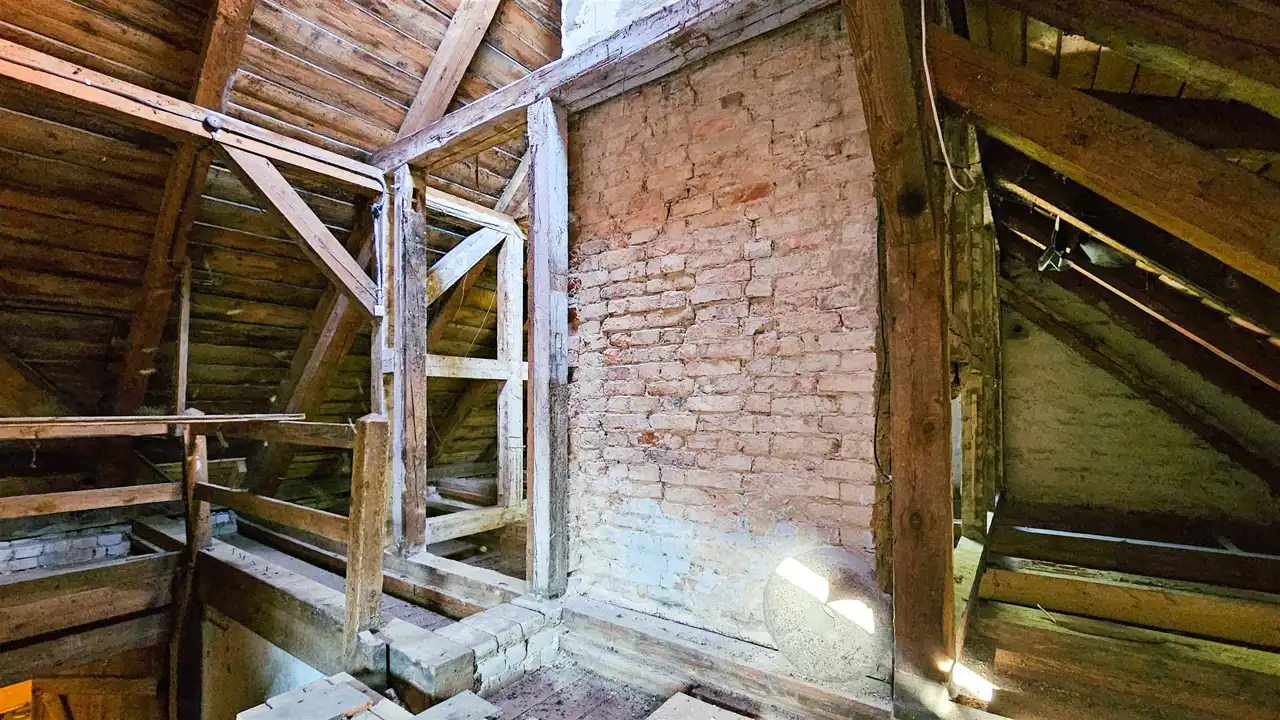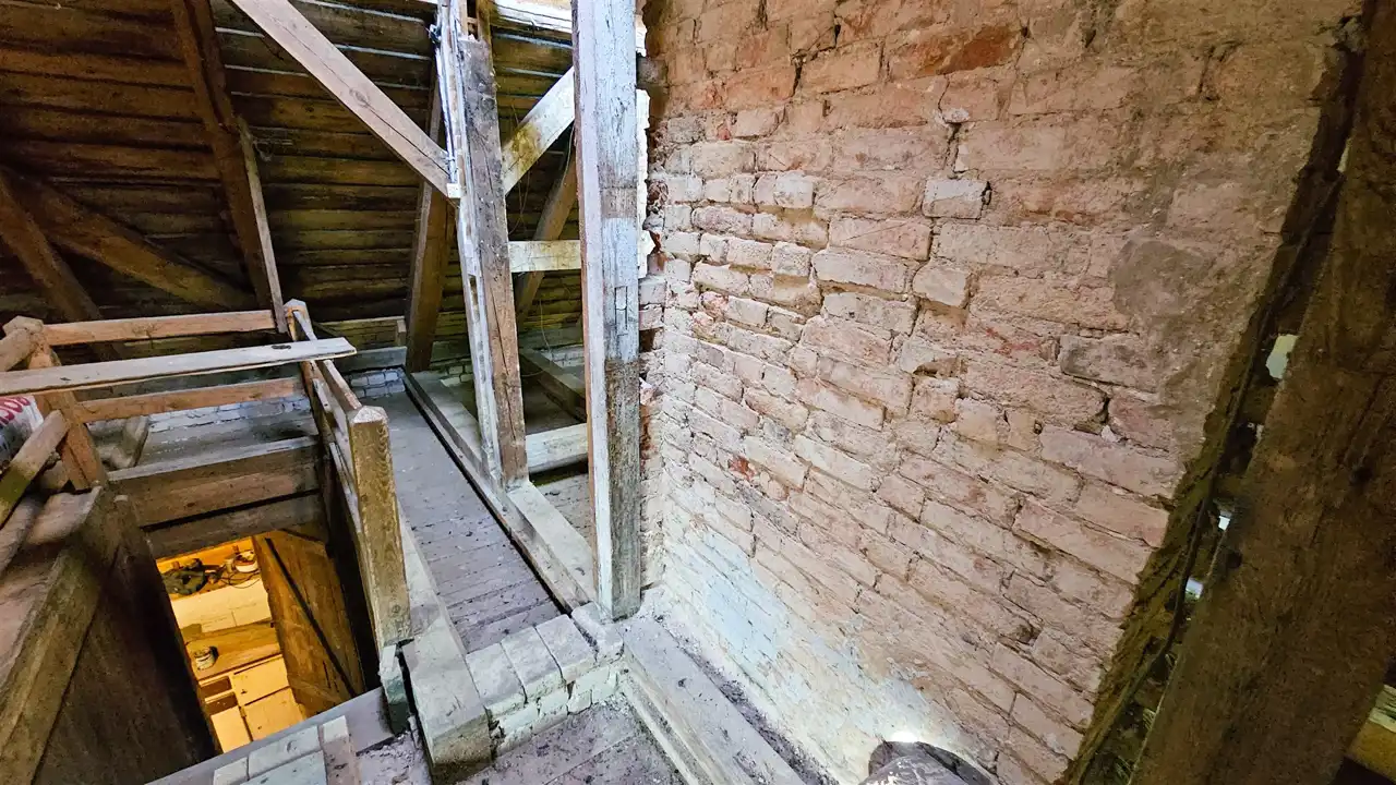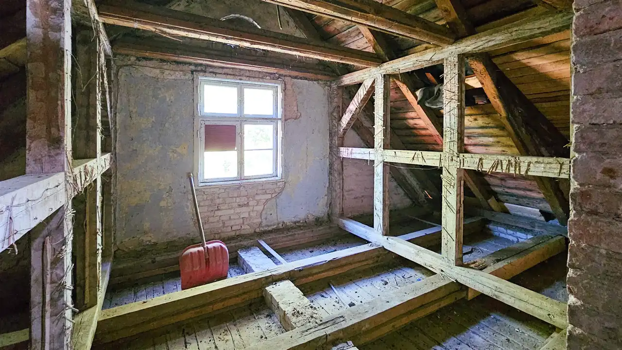 - strop: drewniany, oczyszczony od strony poddasza, przygotowany do ocieplenia