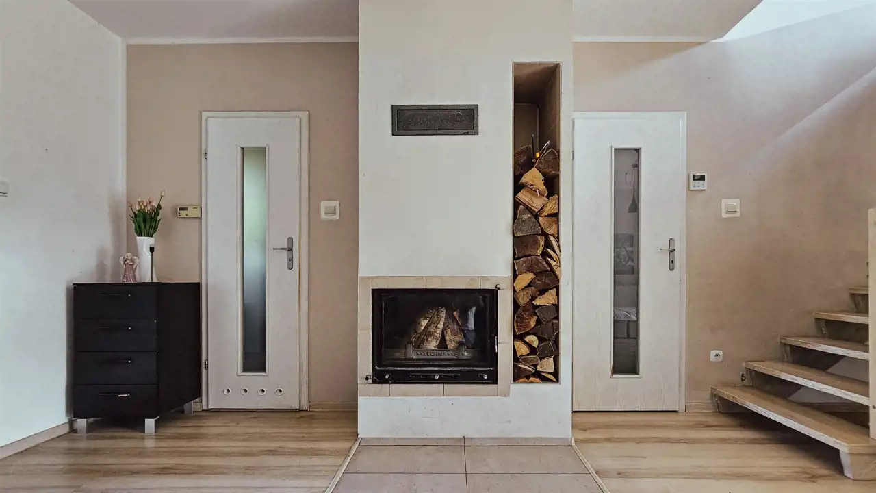 Nieruchomość jest w bardzo dobrym stanie technicznym i gotowa do zamieszkania. Ogrzewanie zapewnia nowoczesna pompa ciepła Panasonic 7 kW oraz kominek w salonie. Dodatkowo zamontowana została instalacja fotowoltaiczna o mocy 3,2 kWp, co obniża koszty eksploatacji. Woda pochodzi z własnego ujęcia – studni głębinowej o głębokości 26m z filtrem, kanalizacja jest miejska. Dach pokryto blachodachówką, a drzwi wejściowe i bramę garażową wymieniono około dwa lata temu. Dostępny jest również internet LTE T-Mobile oraz zasilanie prądem i siłą.
