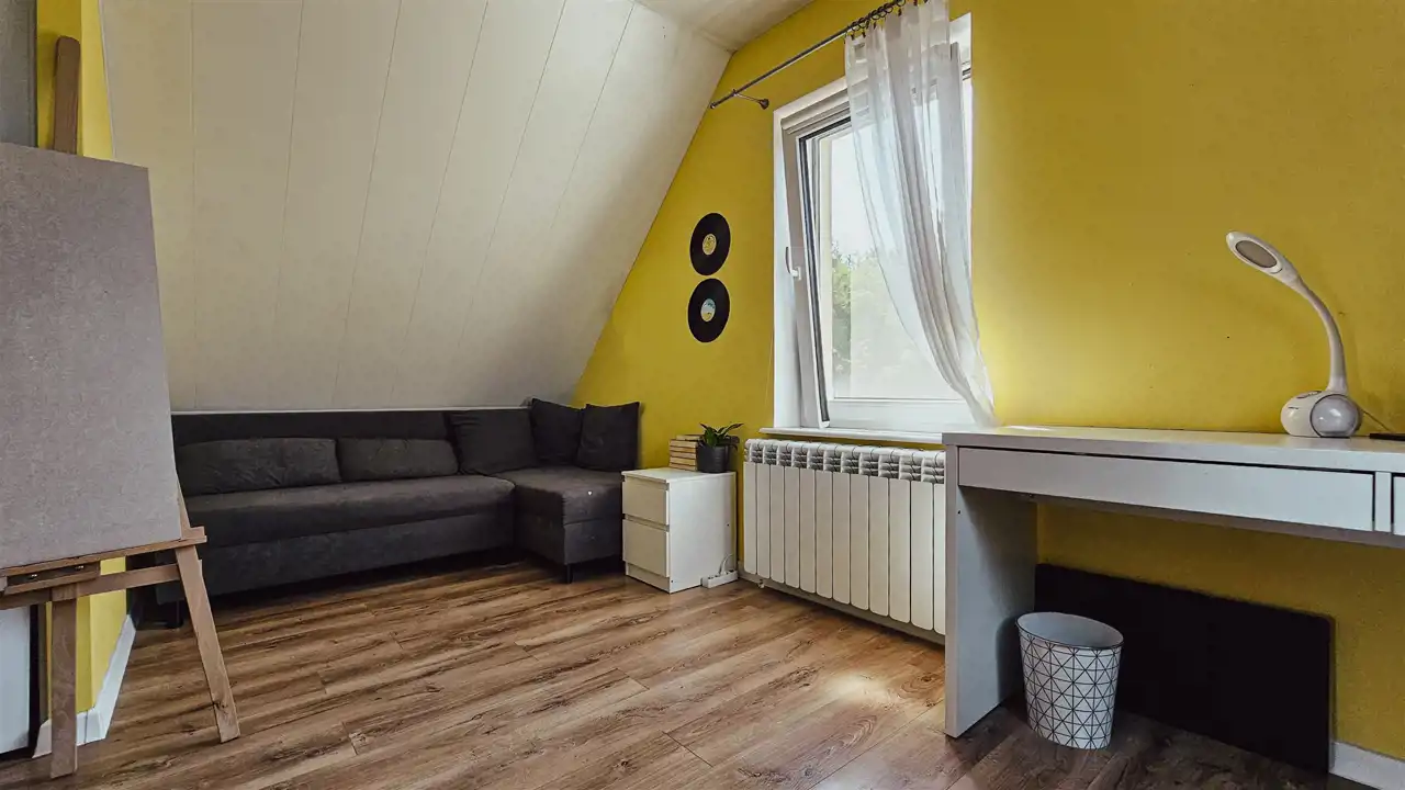 Dom wybudowany w 2008 roku z materiału ytong, z dbałością o funkcjonalny układ pomieszczeń, który doskonale sprawdzi się nawet dla pięcioosobowej rodziny. Na parterze znajduje się wiatrołap, przestronny salon z aneksem kuchennym i jadalnią, dwa pokoje, łazienka wyposażona w wannę, WC, umywalkę i pralką. Piętro to dwa kolejne pokoje oraz łazienka z prysznicem, WC i umywalką. Z salonu można wyjść na taras o powierzchni 30 m², który stanowi naturalne przedłużenie strefy dziennej. Garaż w bryle budynku posiada dodatkowe wyjście do ogrodu. Wnętrza są jasne i przytulne, wyposażone w trzyszybowe okna PCV.