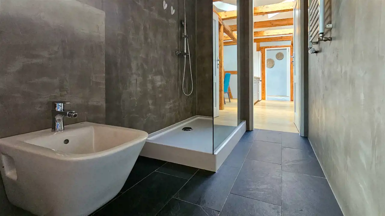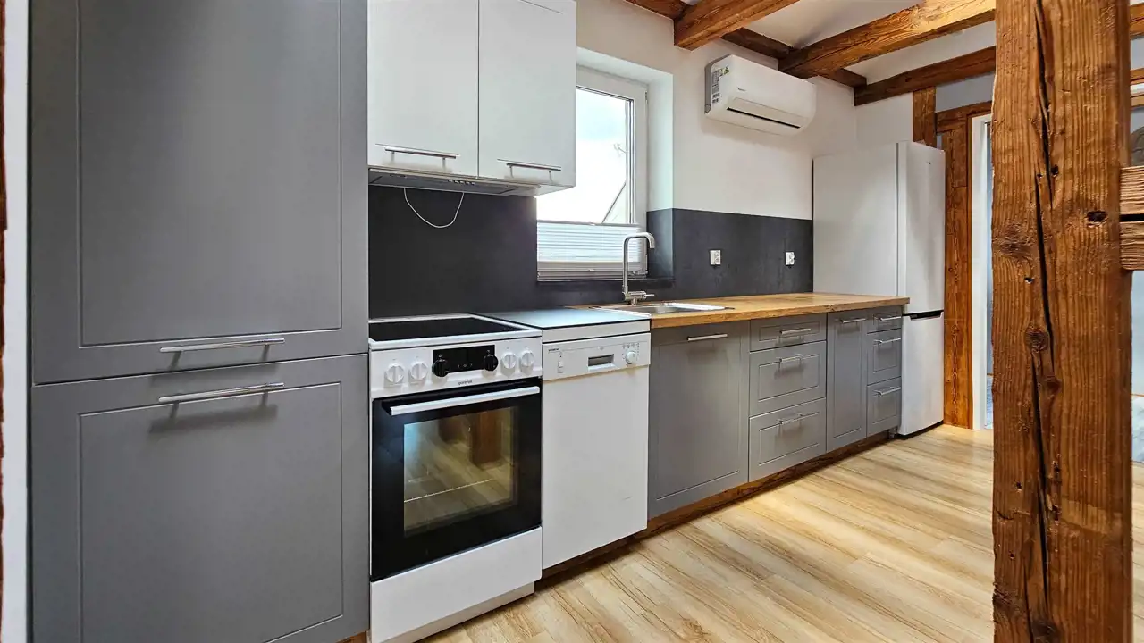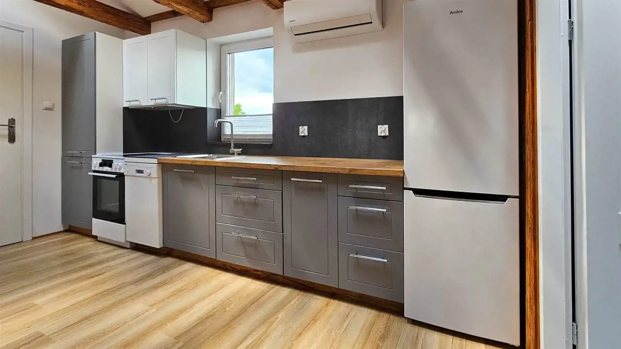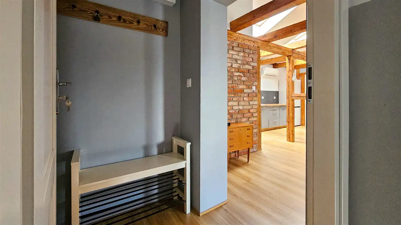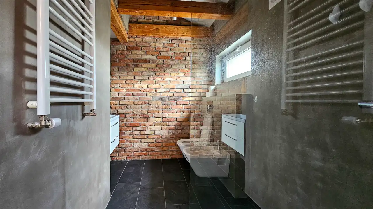 Łazienka została wyposażona w prysznic, umywalkę, WC oraz bidet. Na podłogach znajdują się panele, a trzyszybowe okna PCV zapewniają bardzo dobrą izolację. Kuchnia jest w pełni umeblowana i wyposażona w sprzęt AGD, w tym zmywarkę, lodówkę, okap oraz kuchenkę. W mieszkaniu zamontowana jest klimatyzacja. Dodatkowym udogodnieniem jest pralnia o powierzchni około 2 m², mieszcząca się w prywatnej części klatki schodowej na pierwszym piętrze.