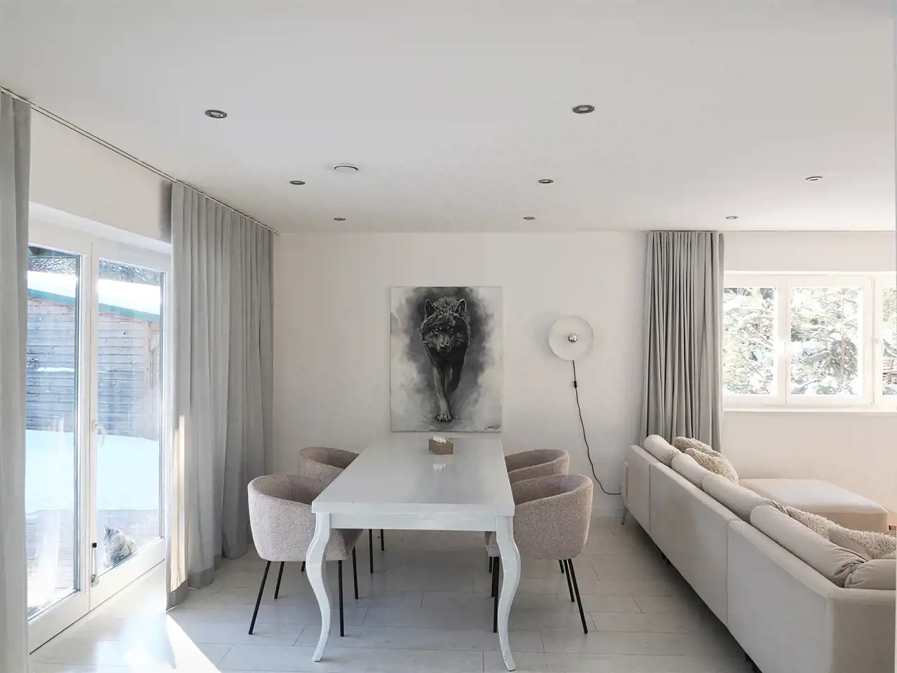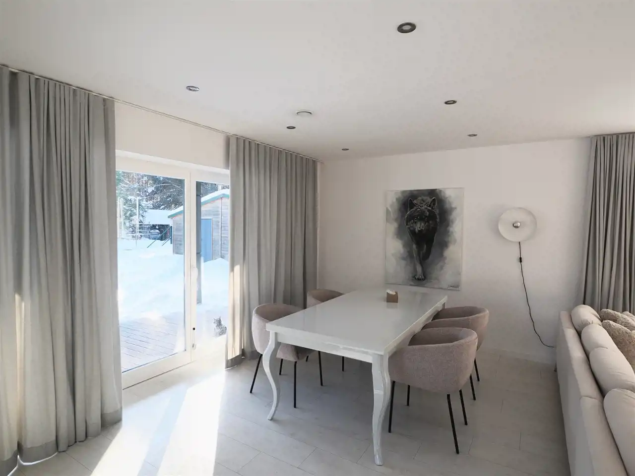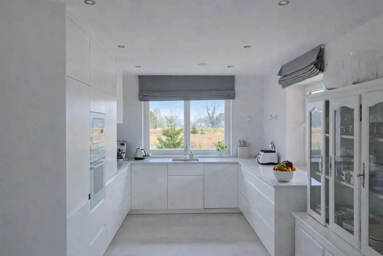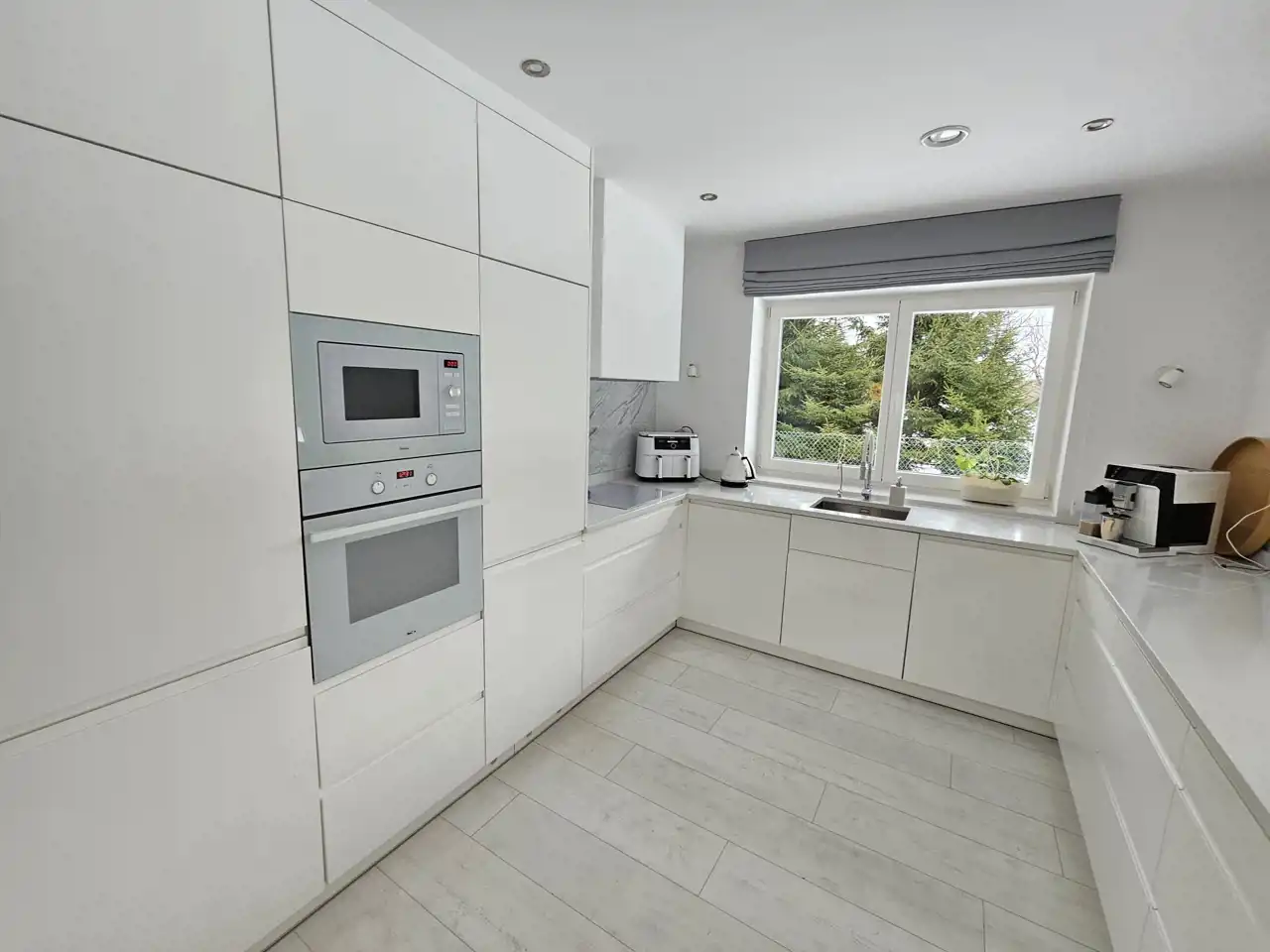 Dom wykończony w wysokim standardzie, w nowoczesnym i ponadczasowym stylu. Jasna kolorystyka wnętrz oraz duże przeszklenia zapewniają bardzo dobre doświetlenie pomieszczeń światłem dziennym przez większość dnia.
