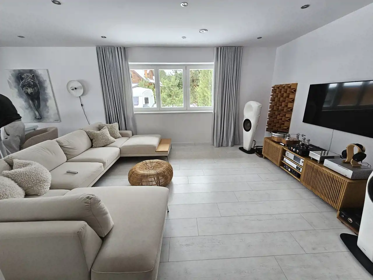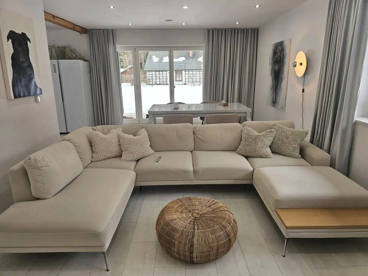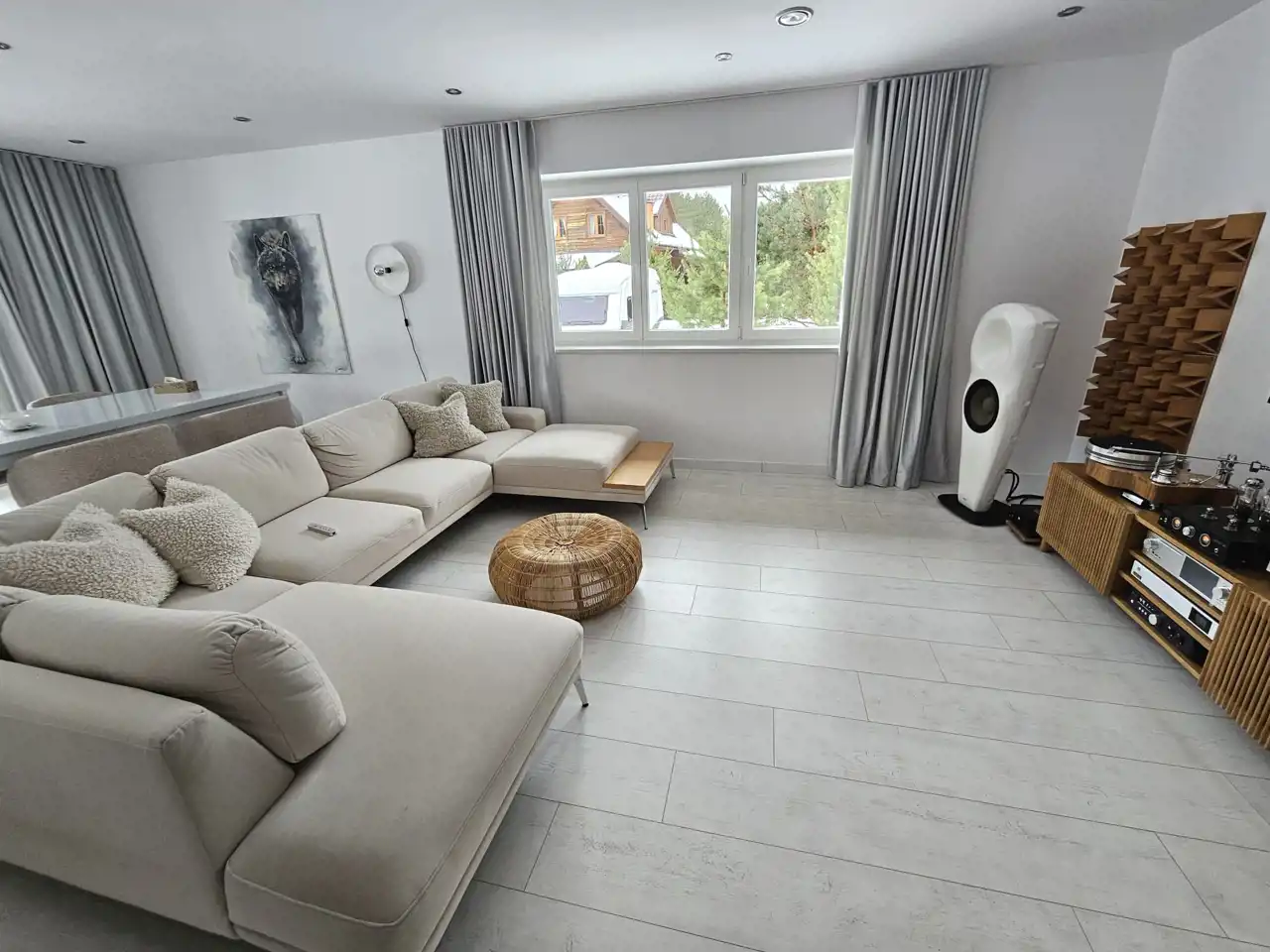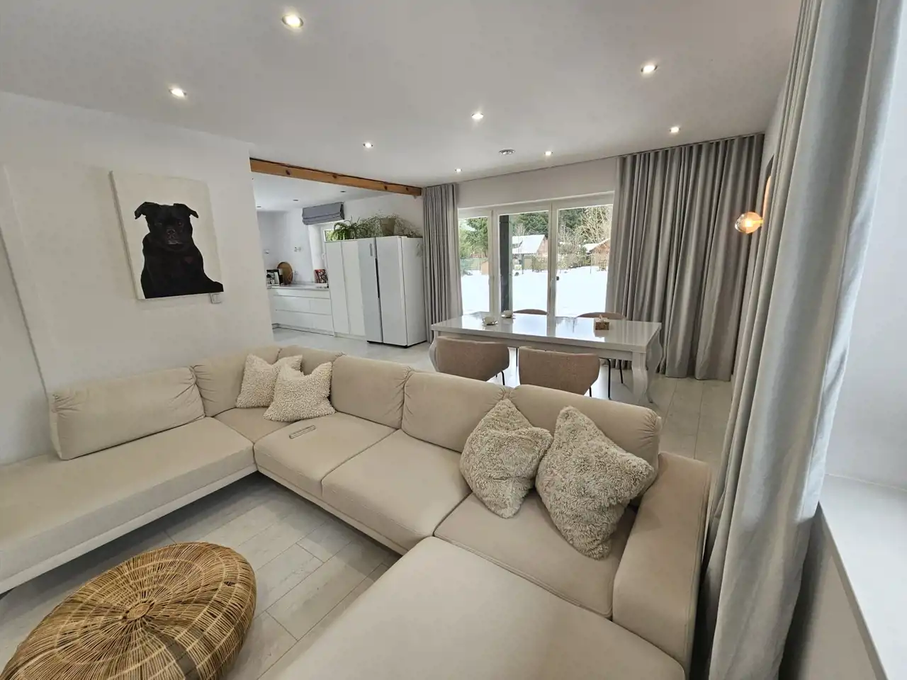 Dom wykończony w wysokim standardzie, w nowoczesnym i ponadczasowym stylu. Jasna kolorystyka wnętrz oraz duże przeszklenia zapewniają bardzo dobre doświetlenie pomieszczeń światłem dziennym przez większość dnia.