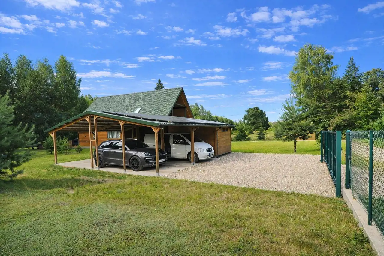 Na działce znajduje się wiata garażowa na cztery samochody, pomieszczenie gospodarcze oraz szopa. Duża powierzchnia działki zapewnia prywatność oraz szerokie możliwości aranżacyjne.