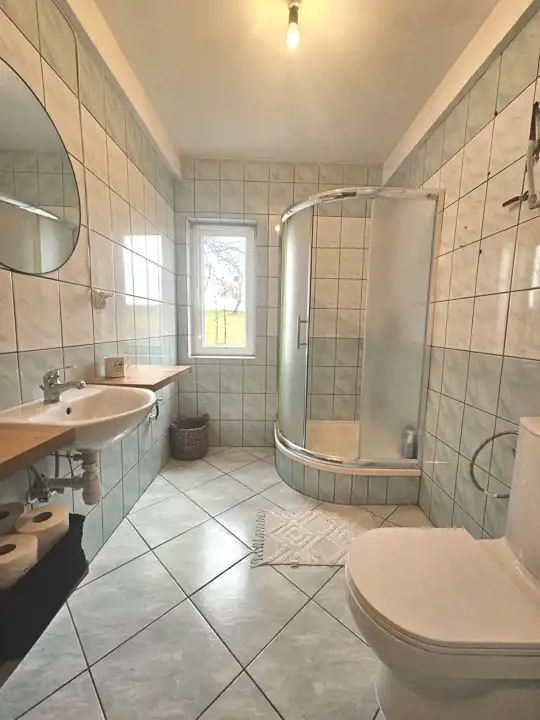 - Prąd z sieci, woda z własnej studni, szambo, możliwość podłączenia internetu.