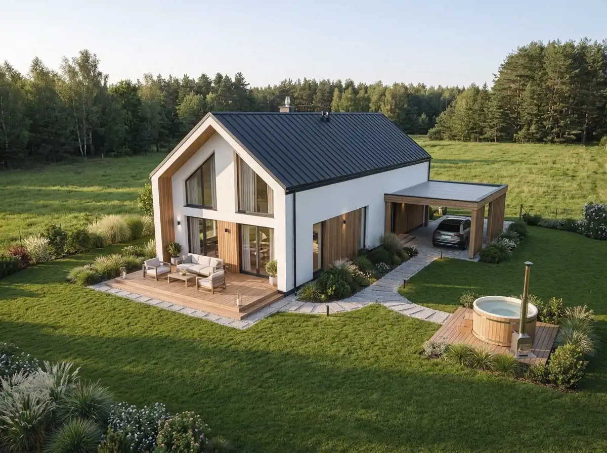 Dom realizowany według projektu nowoczesnej „stodoły”, z naciskiem na trwałość i energooszczędność.