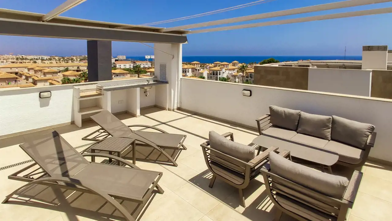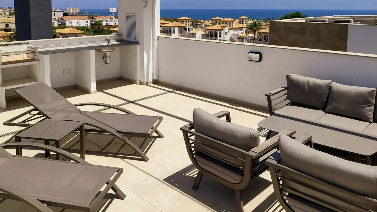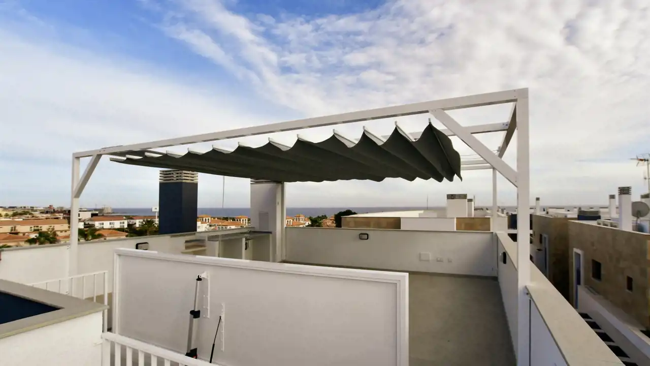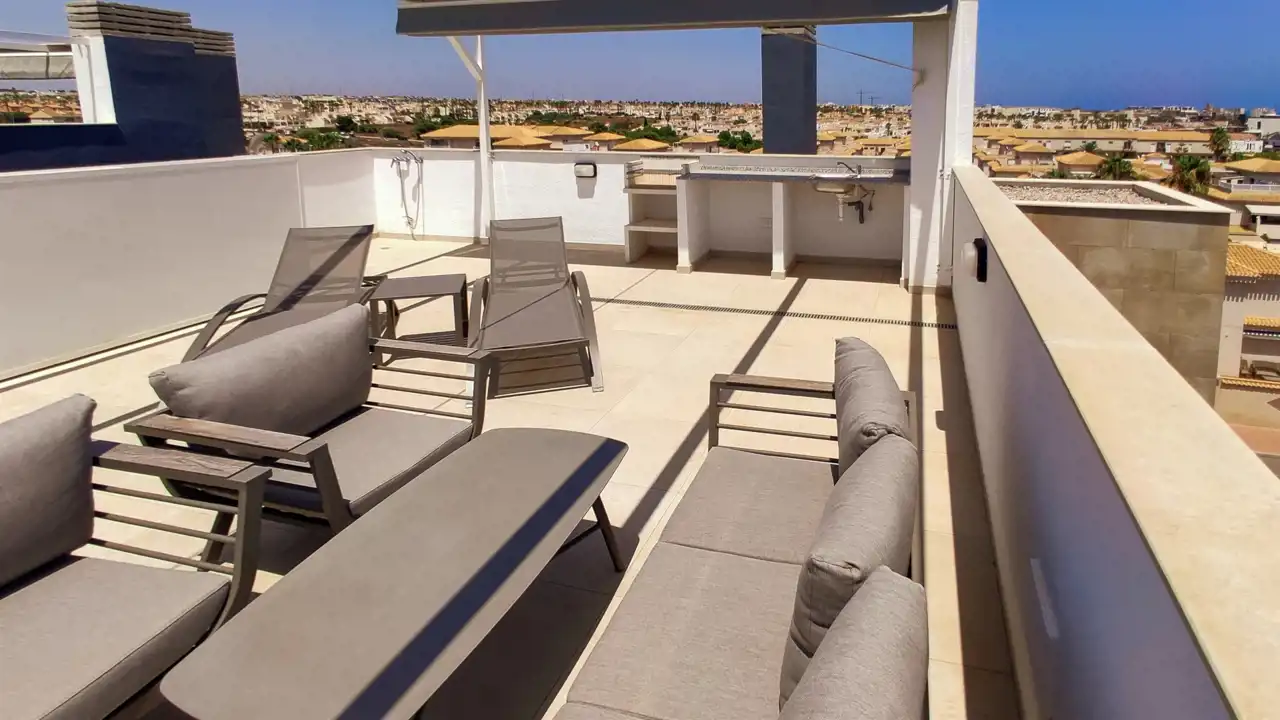 Wewnętrzne schody prowadzą na taras –solarium, gdzie została zaaranżowana przestrzeń do biesiadowania i rekreacji. Na powierzchni ok 52m znajduje się letnia kuchnia z grillem i zlewem, pergola zapewniająca ochronę przed słońcem w miarę potrzeby, zestaw wypoczynkowy obejmujący kanapy, ławę i leżaki. Z tarasu można cieszyć się panoramicznym widokiem na klimatyczną zabudowę dzielnicy oraz na morze.