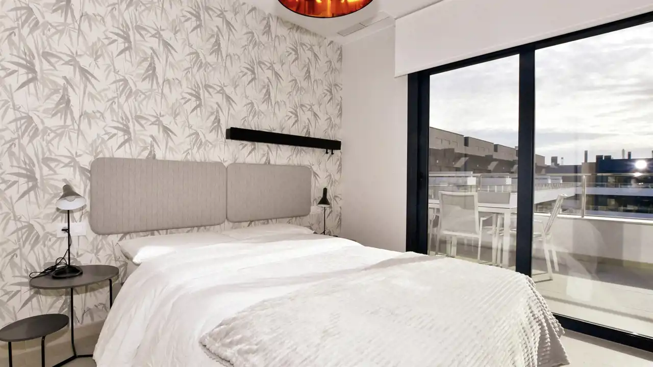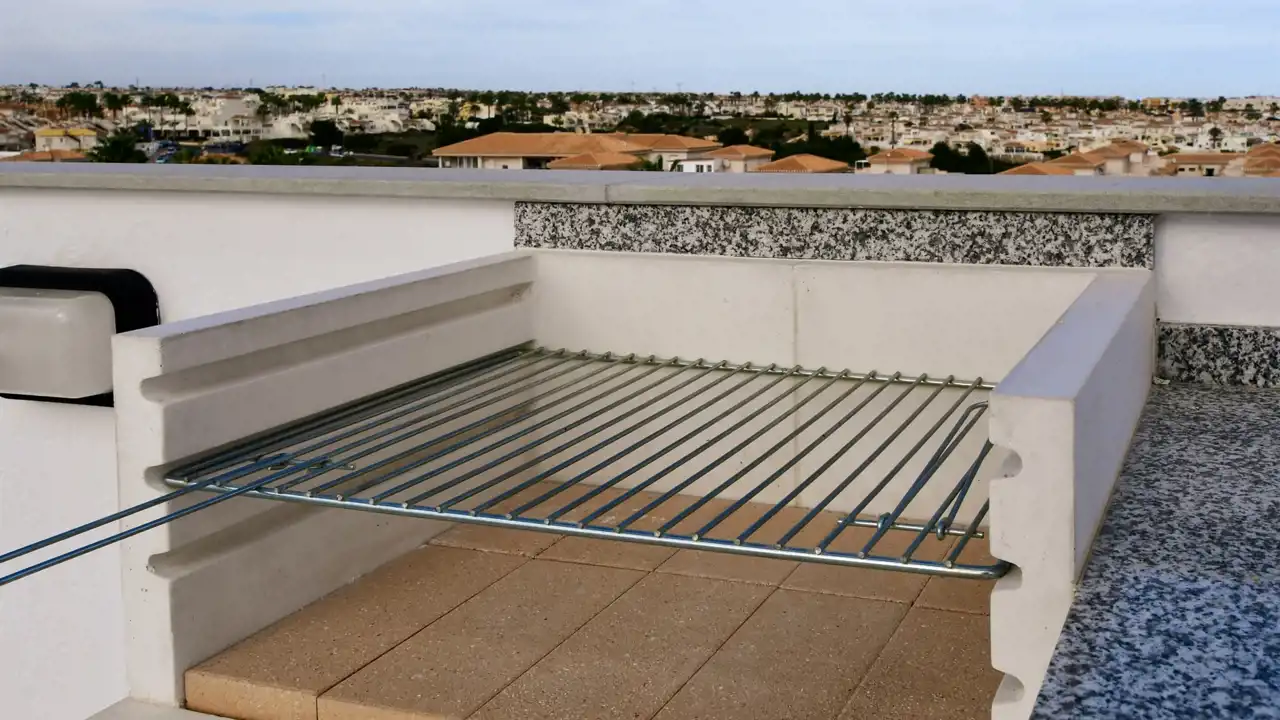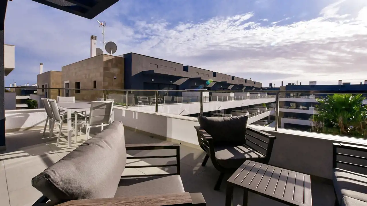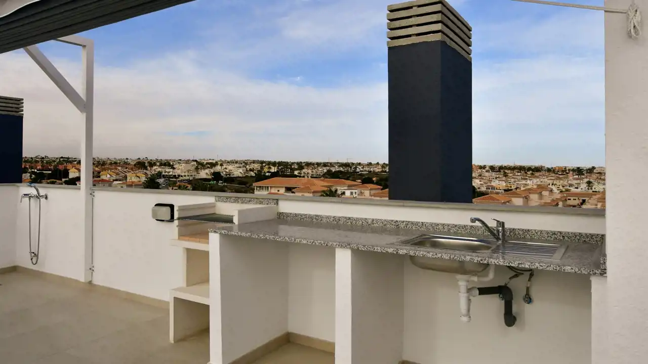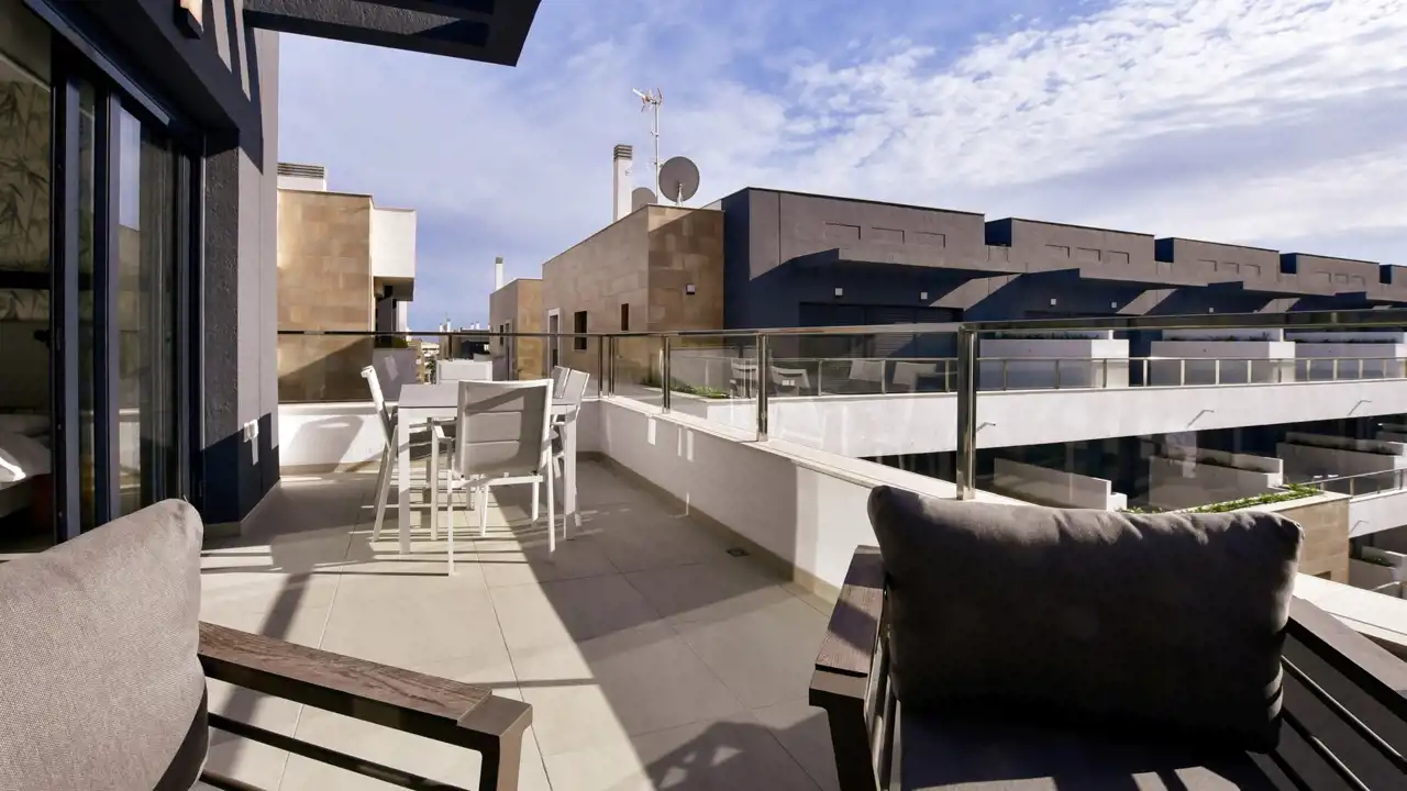 Wewnętrzne schody prowadzą na taras –solarium, gdzie została zaaranżowana przestrzeń do biesiadowania i rekreacji. Na powierzchni ok 52m znajduje się letnia kuchnia z grillem i zlewem, pergola zapewniająca ochronę przed słońcem w miarę potrzeby, zestaw wypoczynkowy obejmujący kanapy, ławę i leżaki. Z tarasu można cieszyć się panoramicznym widokiem na klimatyczną zabudowę dzielnicy oraz na morze.