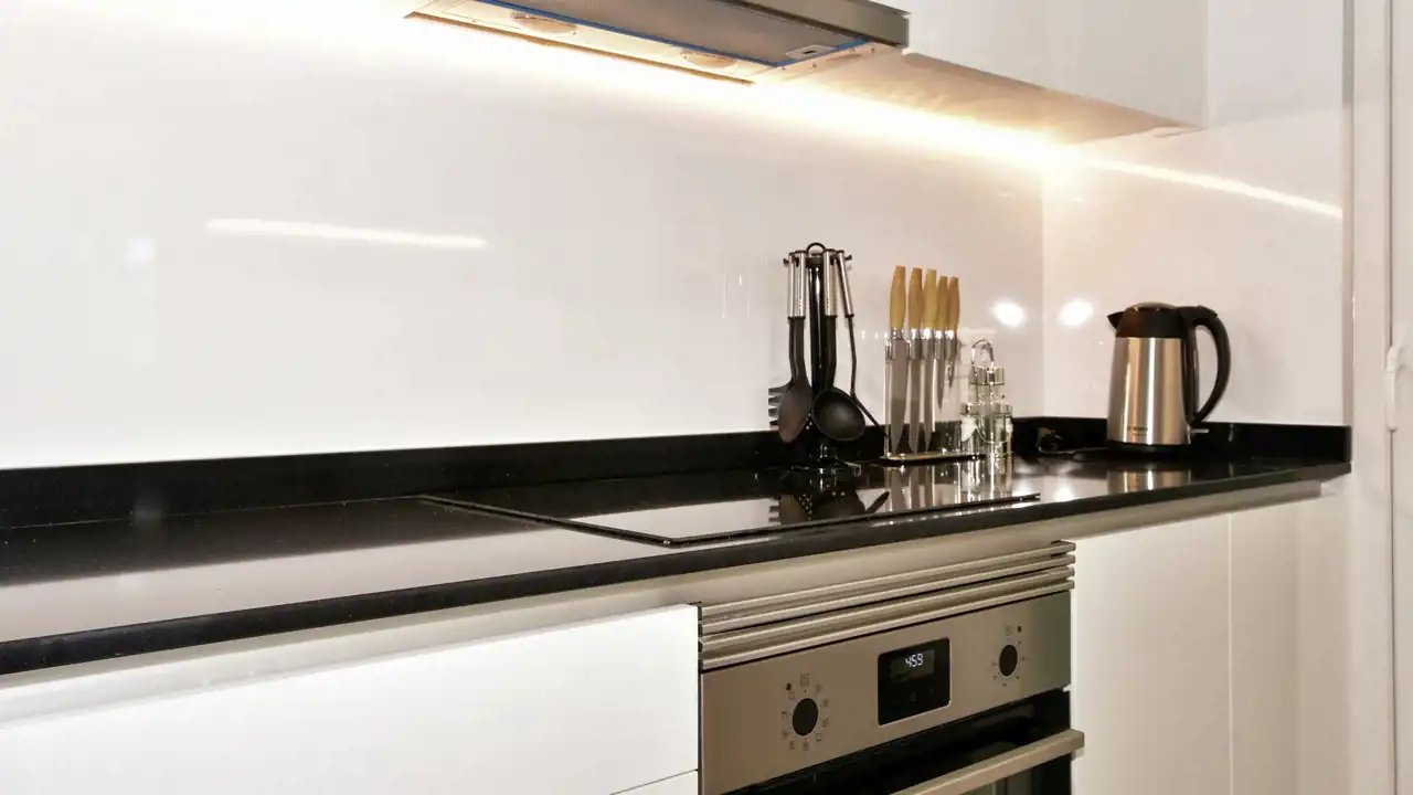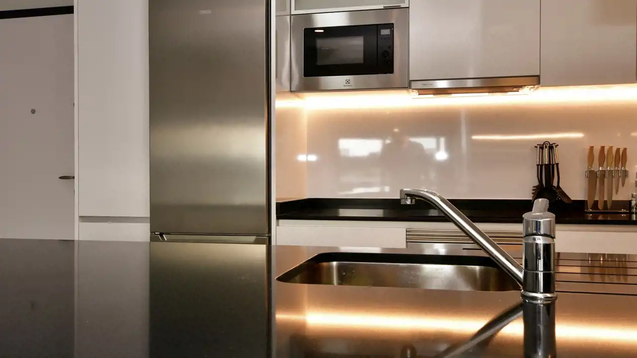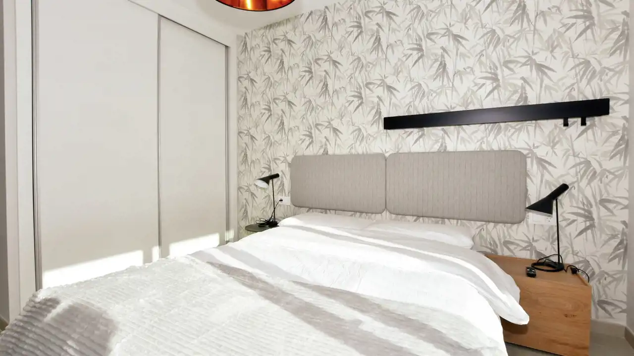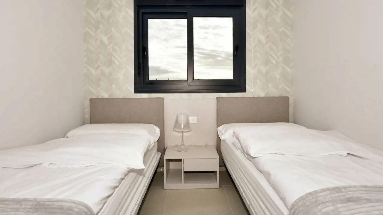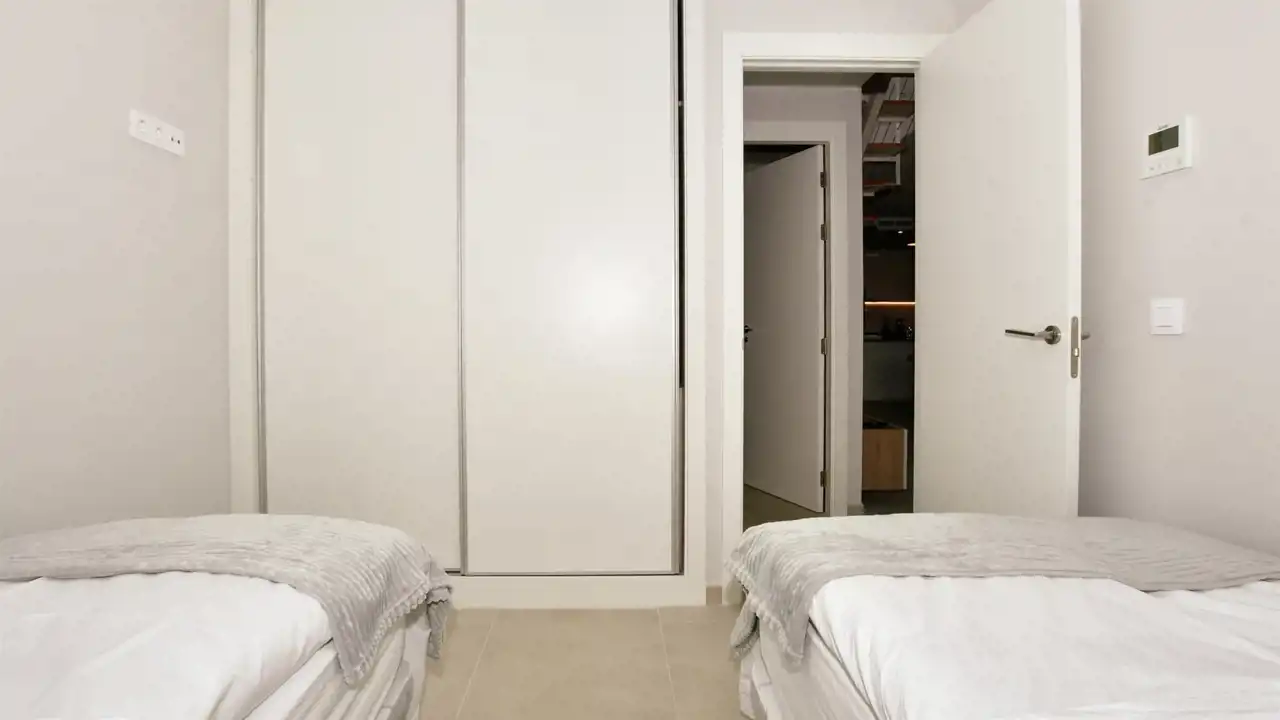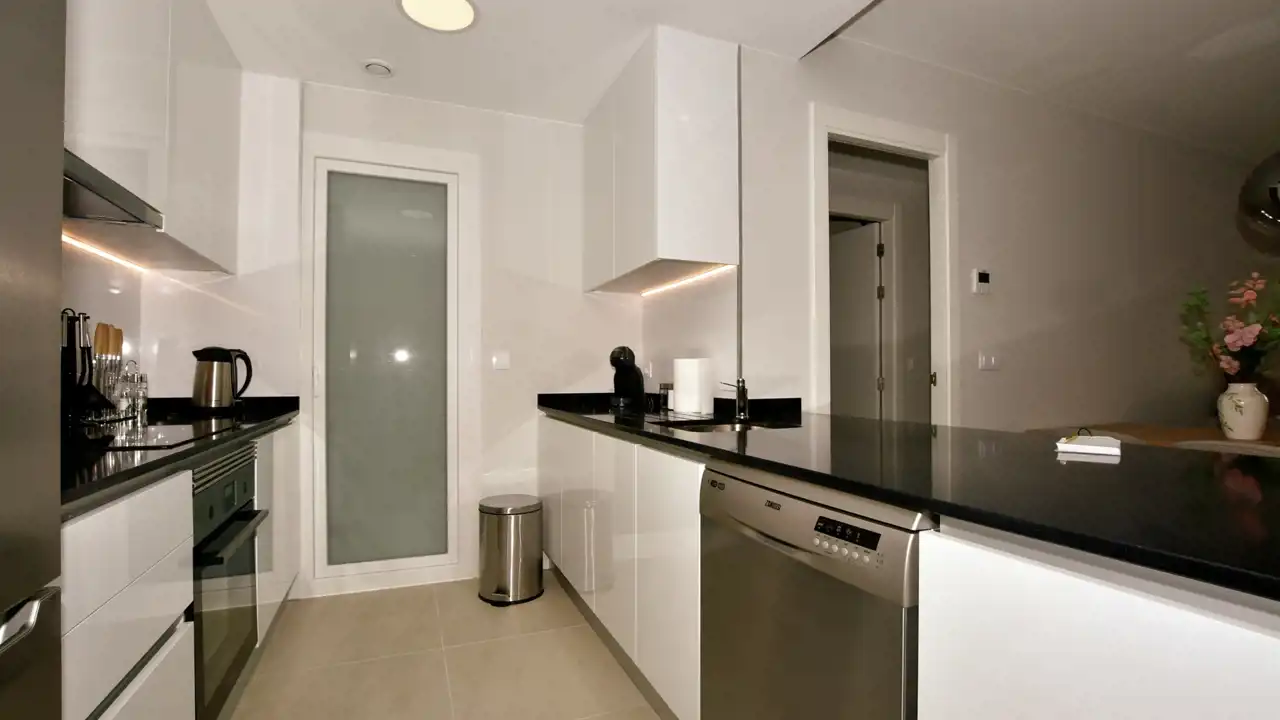 Oferowany apartament posiada dwie sypialnie, dwie łazienki, salon otwarty na kuchnię, do której przylega pomieszczenie gospodarcze. Z salonu wychodzimy na duży taras, o powierzchni ok 20m2, z widokiem na wewnętrzne tereny zielone, wyposażony w stół z 6 krzesłami.