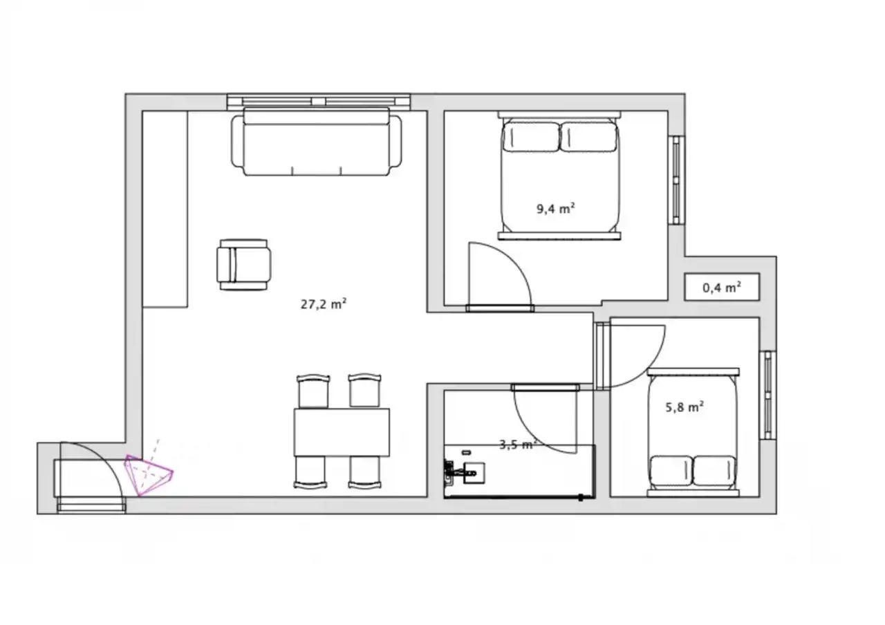 Apartament składa się z 2 sypialni, łazienki, salonu otwartego na kuchnię.