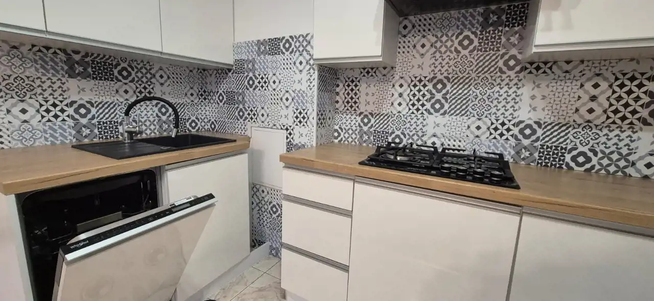 W mieszkaniu pozostaje zabudowa kuchenna, wraz ze zmywarką, płytą gazową, okapem.