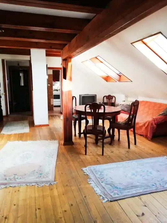 W nieruchomości wyeksponowano drewniane belki stropowe, co nadaje wnętrzu rustykalnego, klasycznego charakteru. Bez wątpienia mieszkanie jest nietuzinkowe i czeka na nowego właściciela.