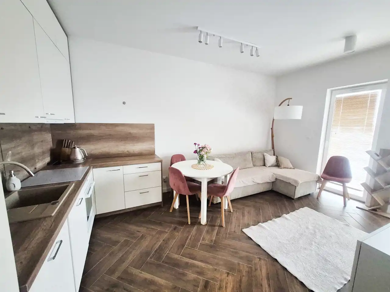 - kuchnia w formie otwartego aneksu połączona z salonem, wyjście na balkon i ogródek,