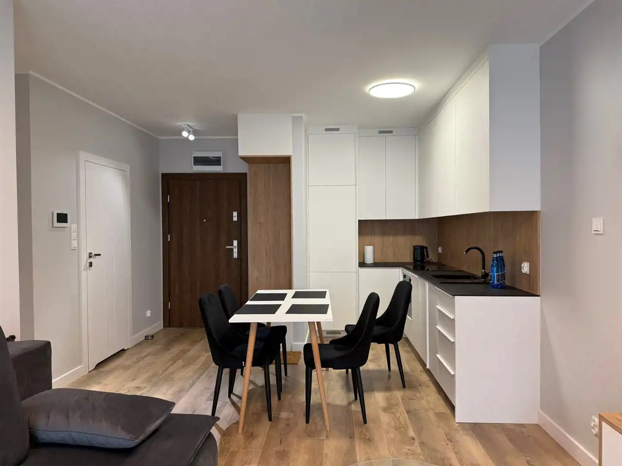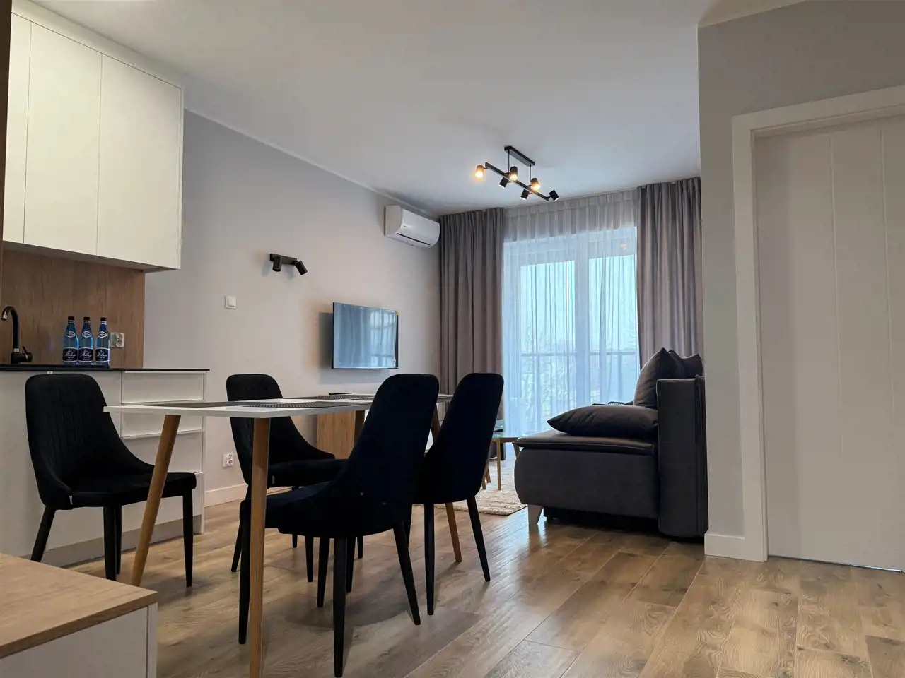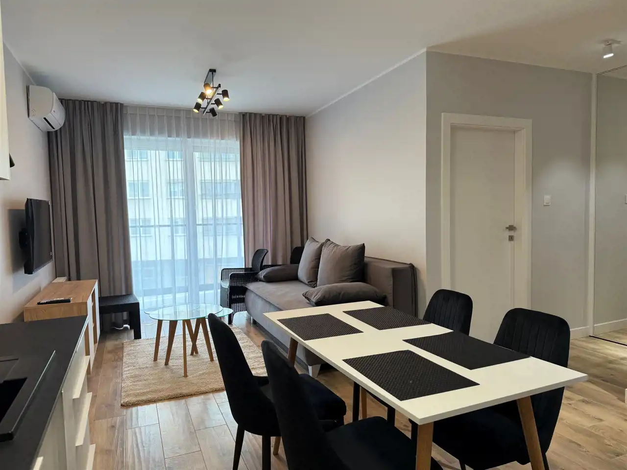 - przestronny, nowocześnie zaaranżowany salon z aneksem kuchennym oraz wyjściem na balkon,