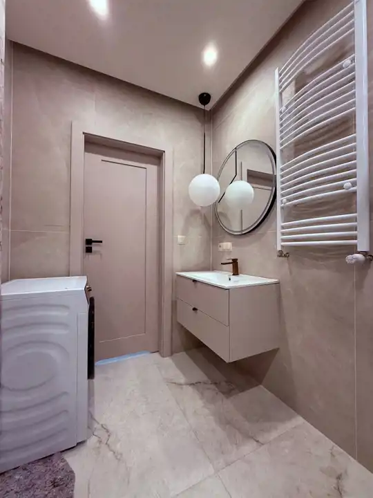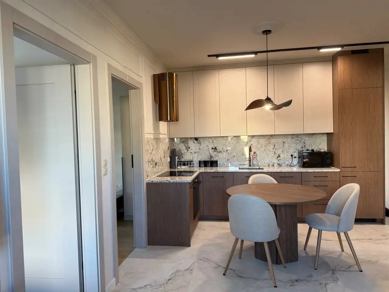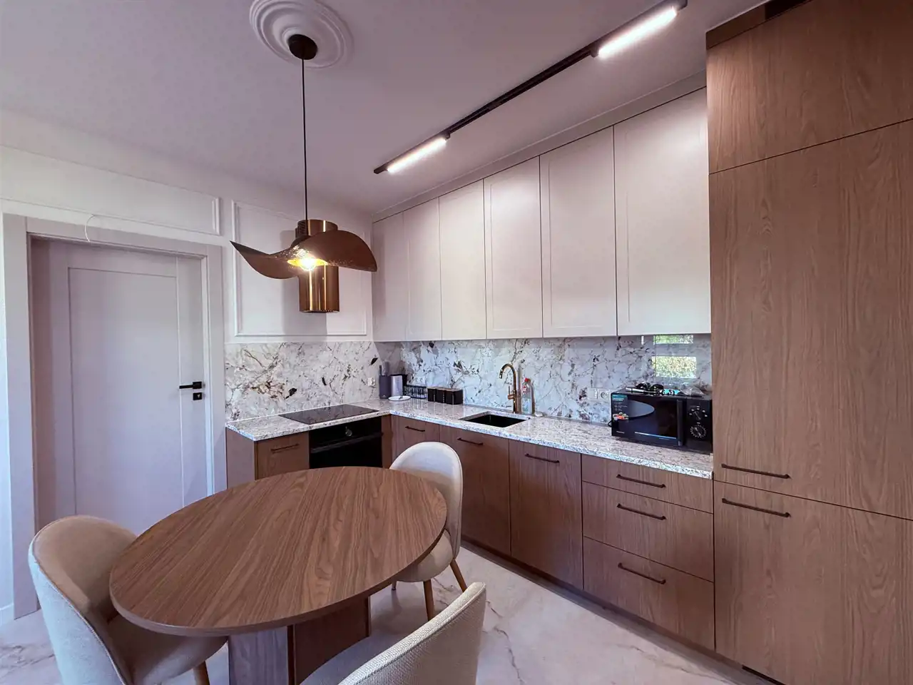 Mieszkanie urządzone elegancko i nowocześnie z wykorzystaniem wysokiej jakości materiałów.