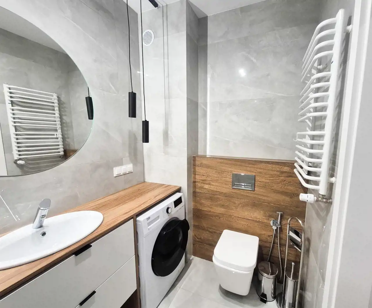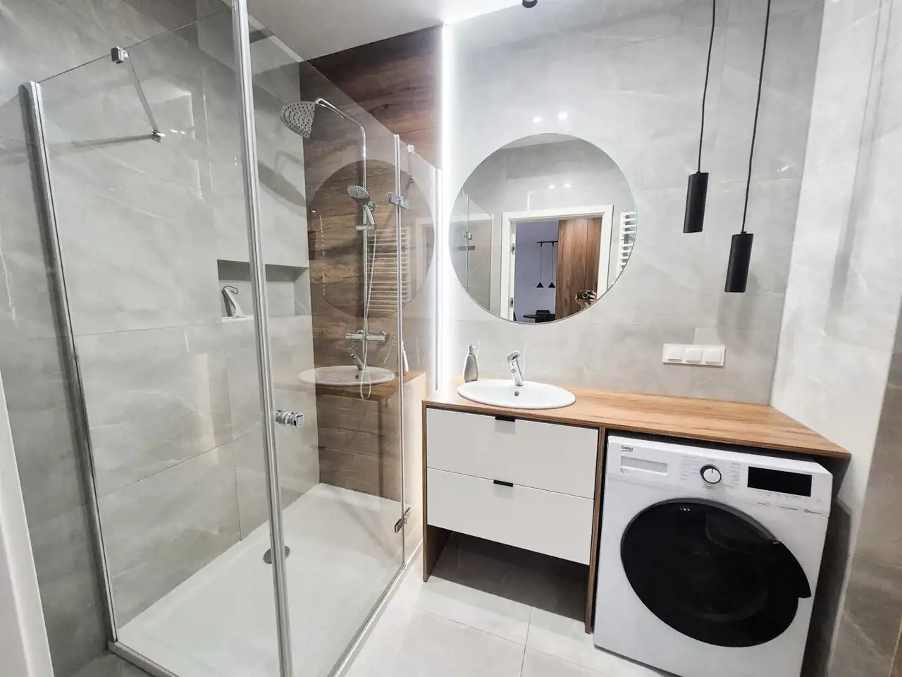 - łazienka z kabiną prysznicową, pralką oraz toaletą z funkcją bidetu,