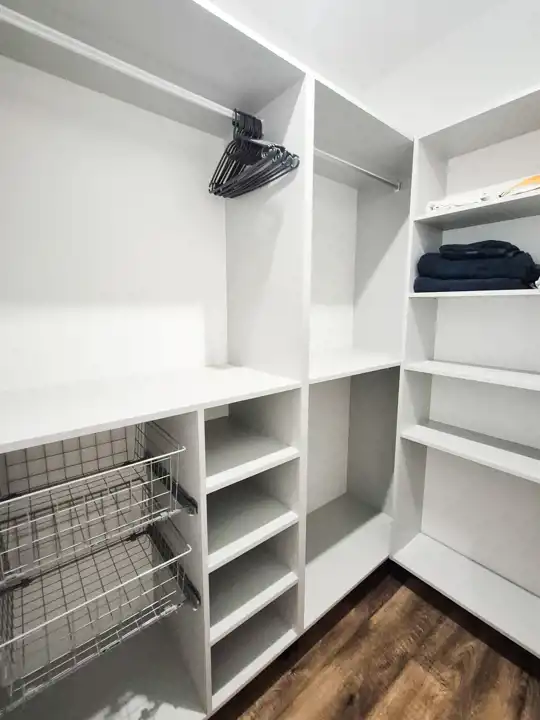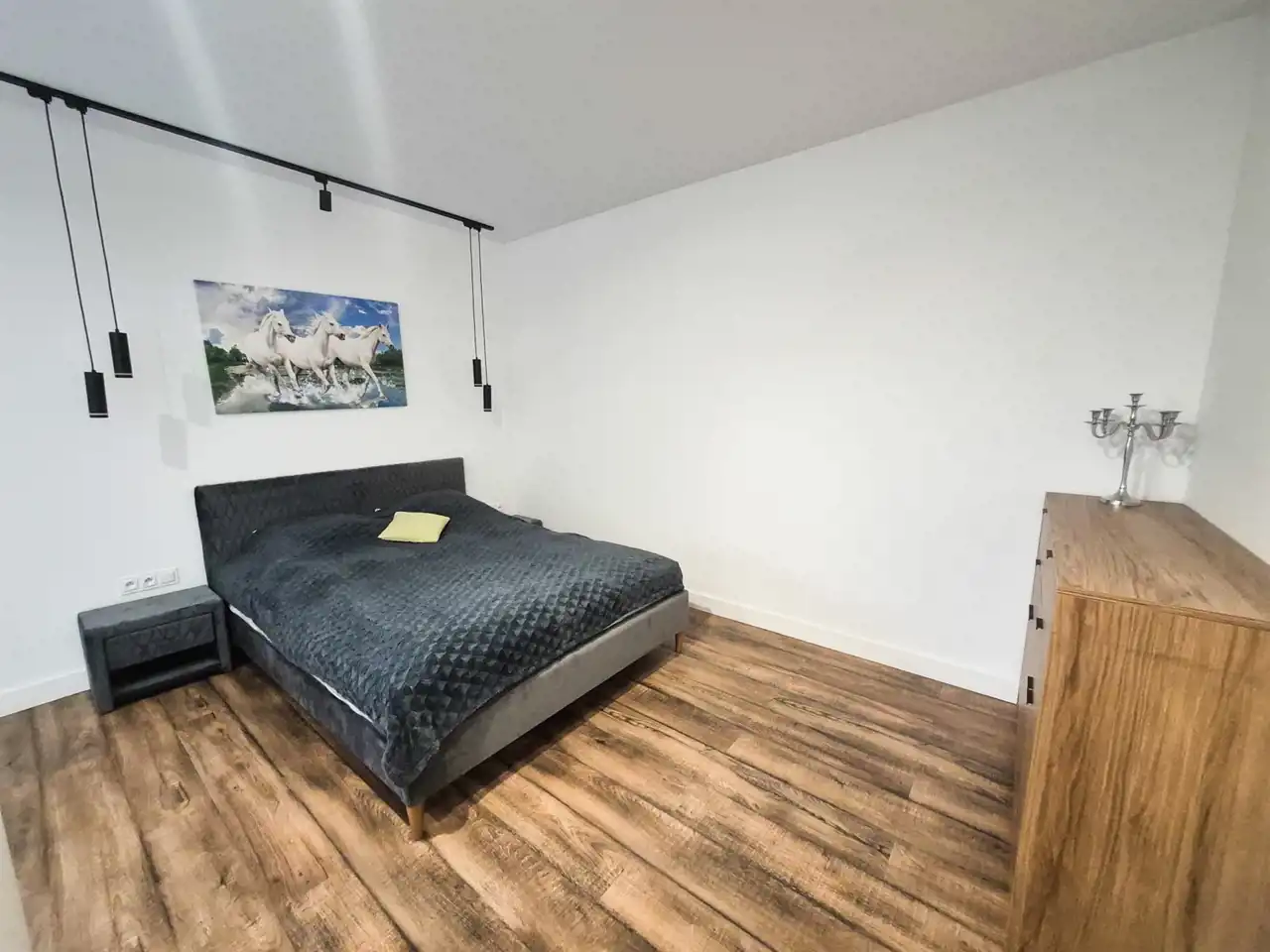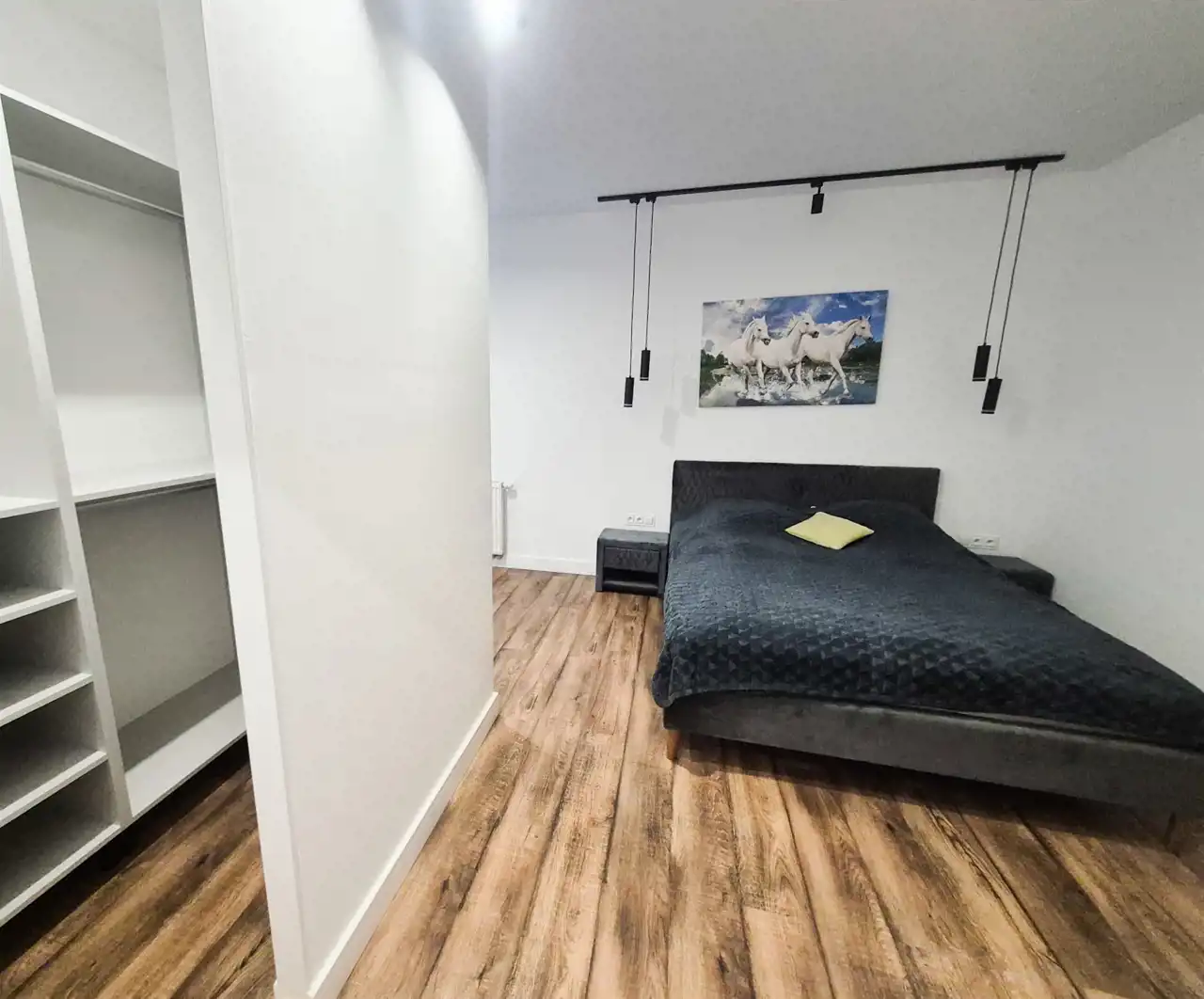 - sypialnia z podwójnym łóżkiem i szafkami nocnymi oraz garderobą, wyjście na balkon,