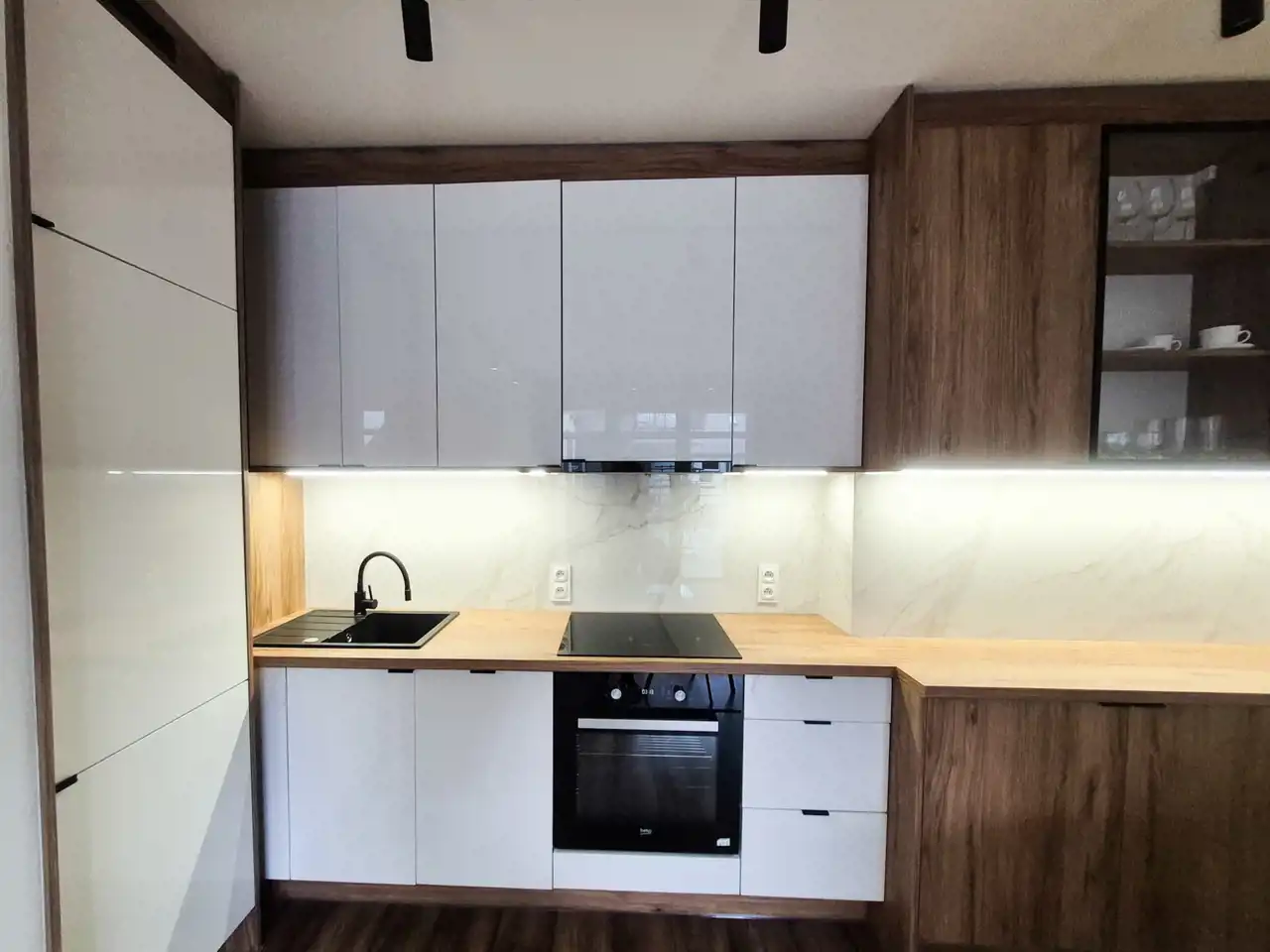 W pełni wyposażona kuchnia (m.in. zmywarka, piekarnik, płyta indukcyjna, lodówka w zabudowie, mikrofalówka);