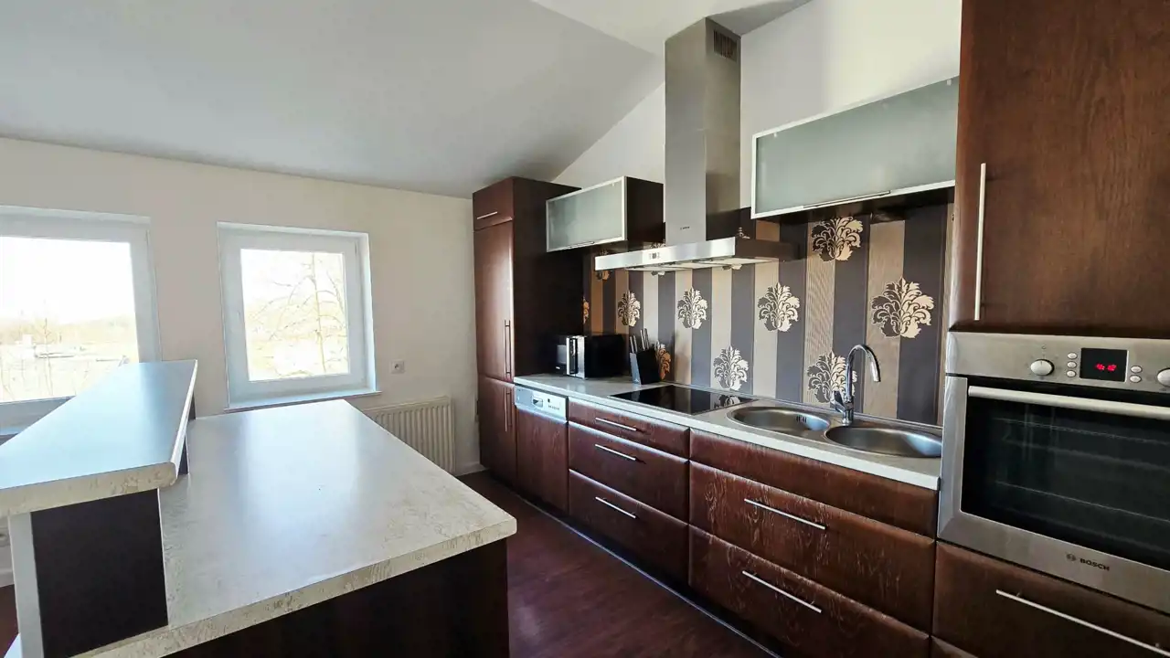 Mieszkanie posiada umeblowaną i wyposażoną kuchnię (zmywarka, lodówka, płyta indukcyjna, kuchenka), stylowo umeblowany salon i sypialnie.