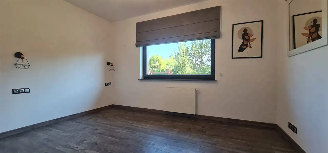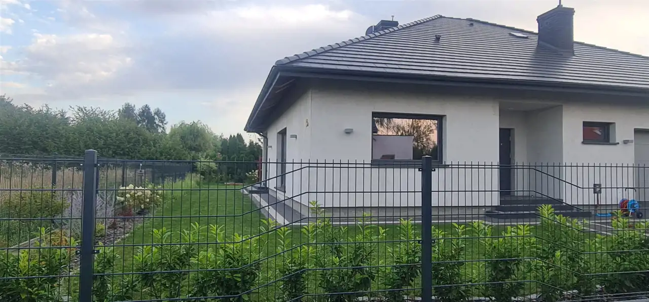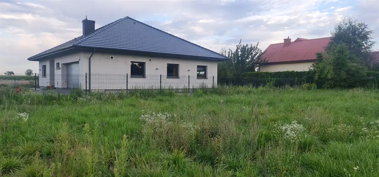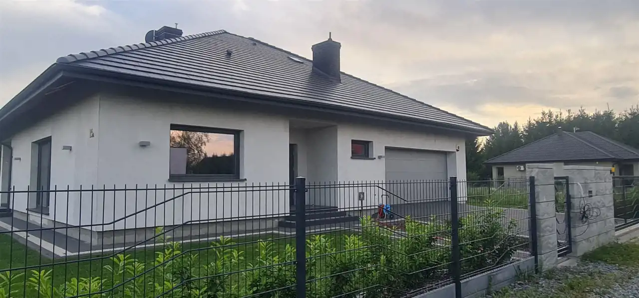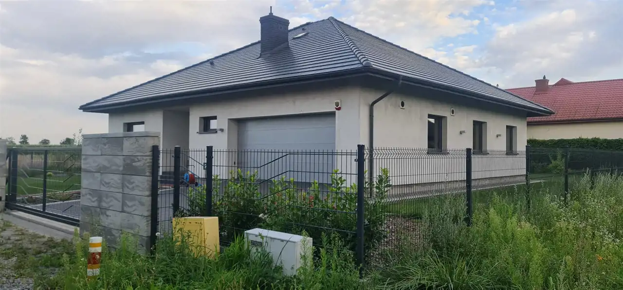 Dom jest parterowy chociaż ma wysokie poddasze. Ładny rozkład pomieszczeń, duży salon i otwarta kuchnia z barkiem z wyjściem na duży taras i ogród, 2 łazienki ,3 sypialnie, garderoba i garaż na 2 samochody. Powierzchnia domu to około 120m2 na działce 900m2. Ogrzewanie podłogowe a w sypialniach grzejniki z pieca gazowego.