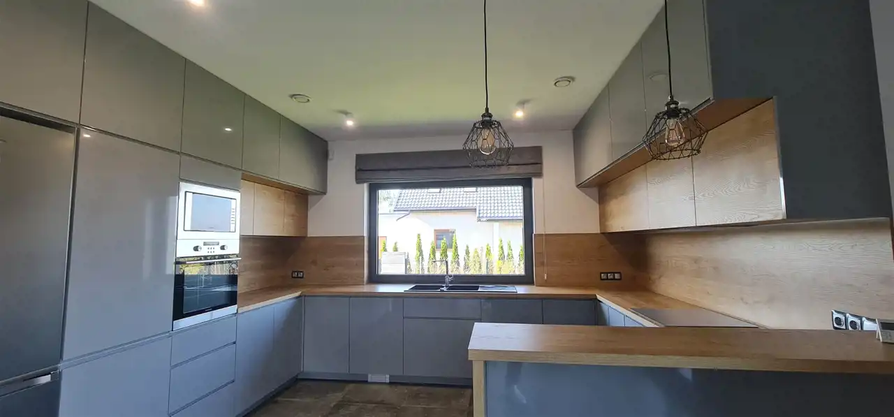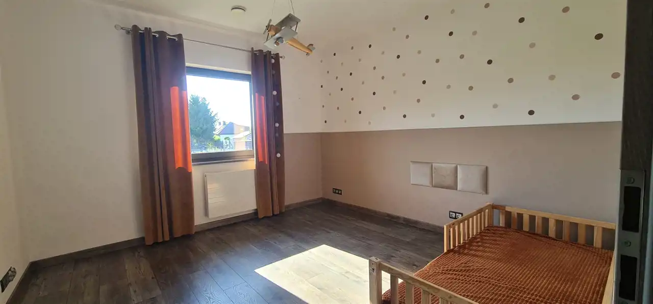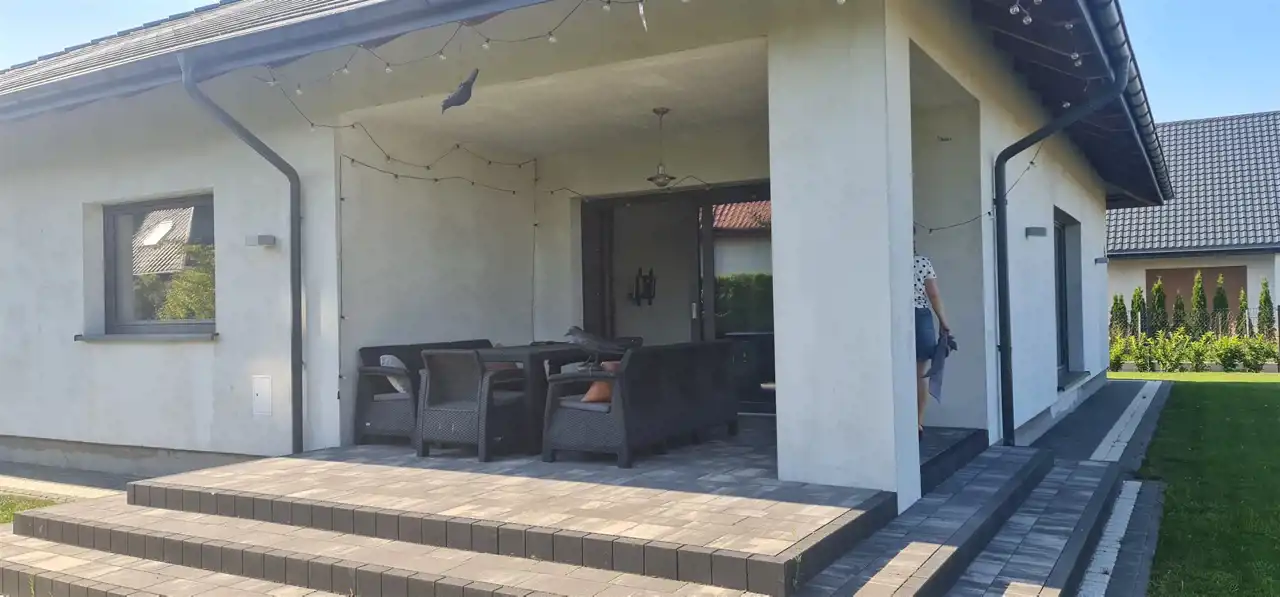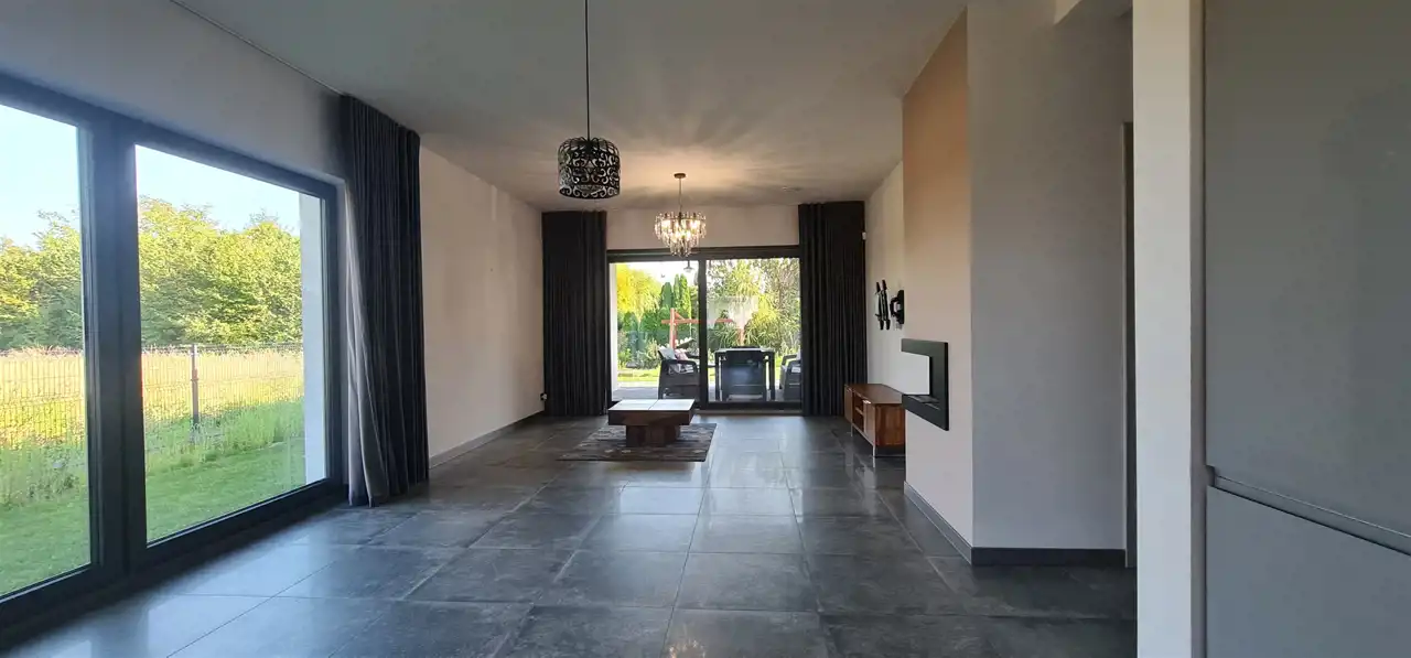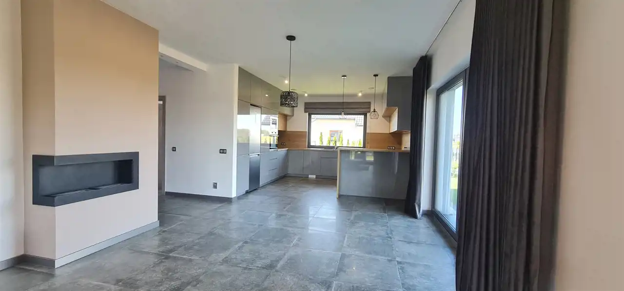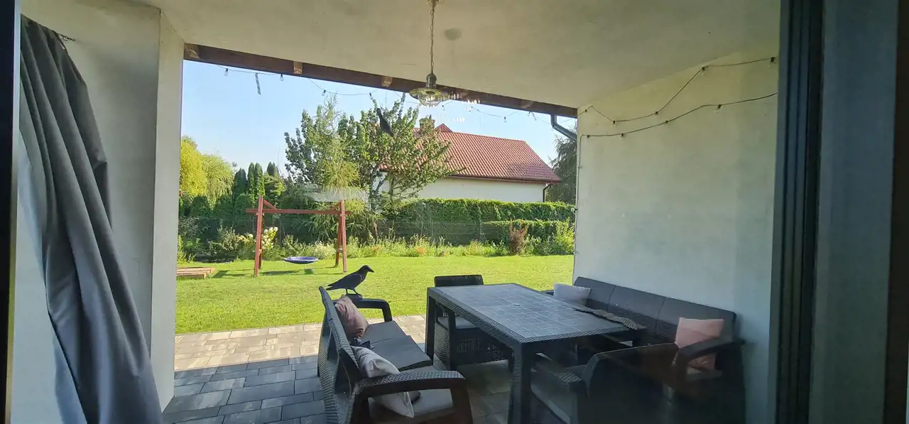 Dom jest parterowy chociaż ma wysokie poddasze. Ładny rozkład pomieszczeń, duży salon i otwarta kuchnia z barkiem z wyjściem na duży taras i ogród, 2 łazienki ,3 sypialnie, garderoba i garaż na 2 samochody. Powierzchnia domu to około 120m2 na działce 900m2. Ogrzewanie podłogowe a w sypialniach grzejniki z pieca gazowego.