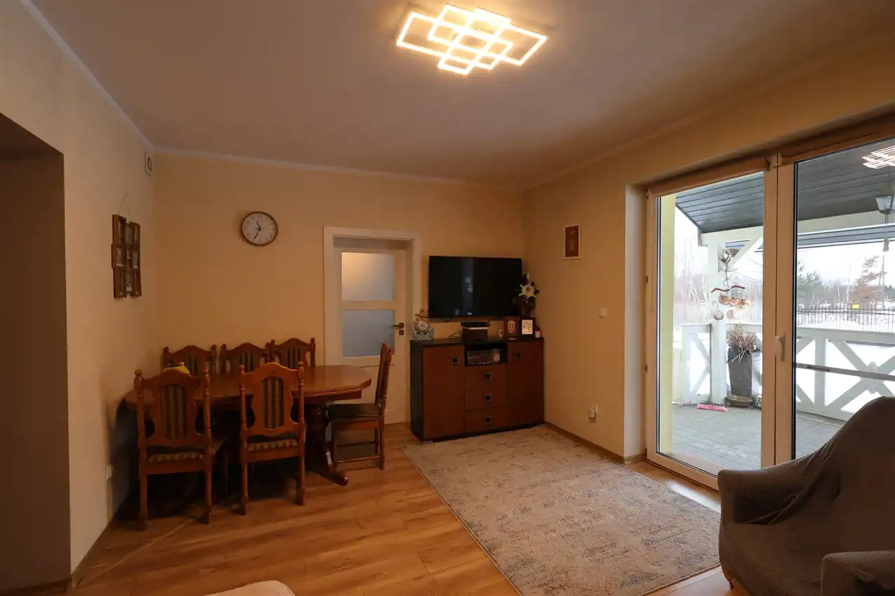 Dom składa się z przestronnego przedpokoju/sieni, dwóch dużych i ustawnych sypialni, dużej kuchni połączonej z salonem oraz łazienki. Ogrzewany jest za pomocą nowoczesnego, wielofunkcyjnego pieca gazowego, zasilającego częściowo ogrzewanie podłogowe, a częściowo kaloryfery. Na działce posadowiona jest zbiornik/butla z gazem na ogrzewanie. W salonie przygotowane jest również miejsce pod kominek. Posesja jest podłączona do sieci energetycznej, wodociągowej oraz telekomunikacyjnej i posiada duże, dwukomorowe szambo. Bezpośredni dojazd do posesji zapewnia droga asfaltowa.