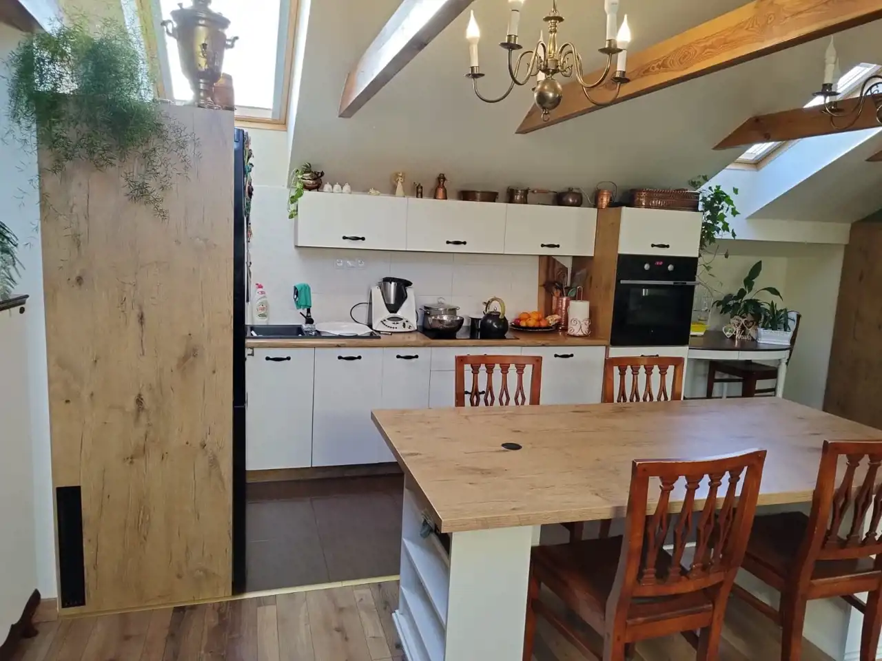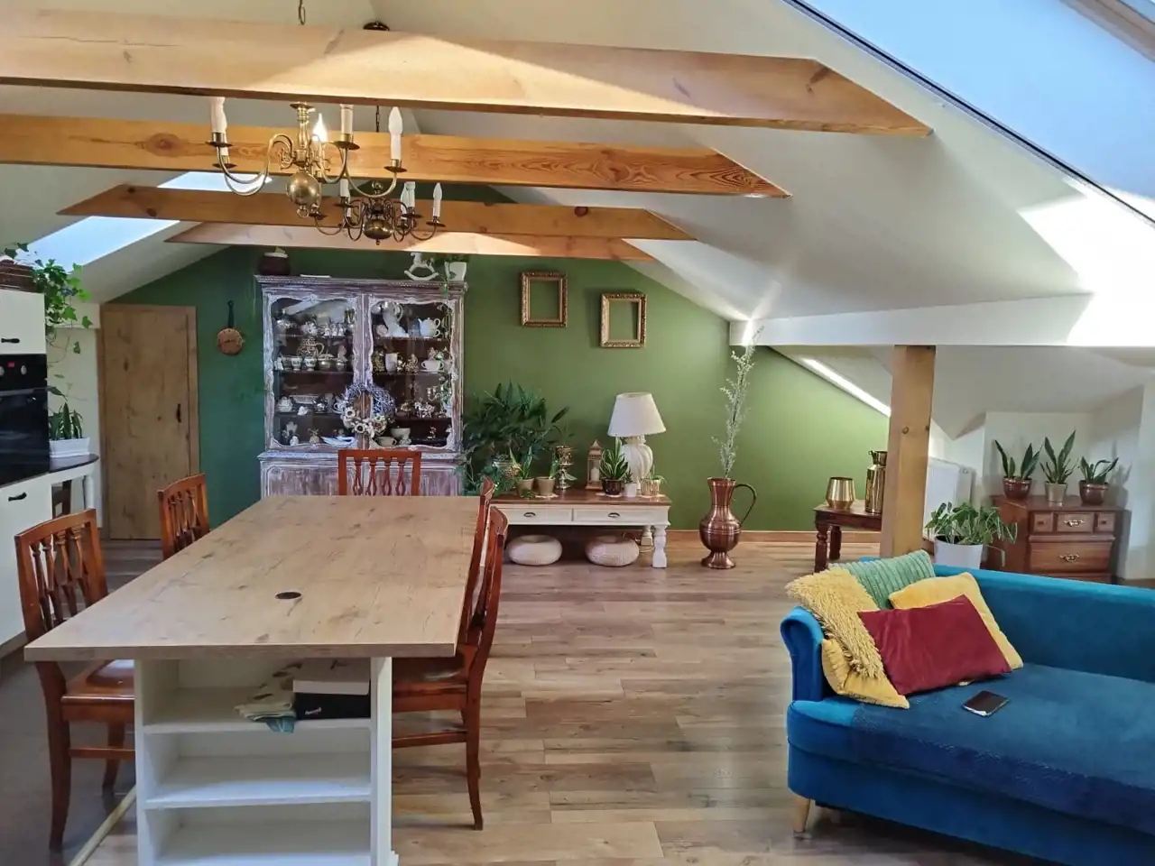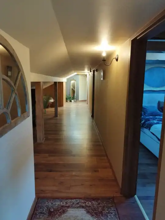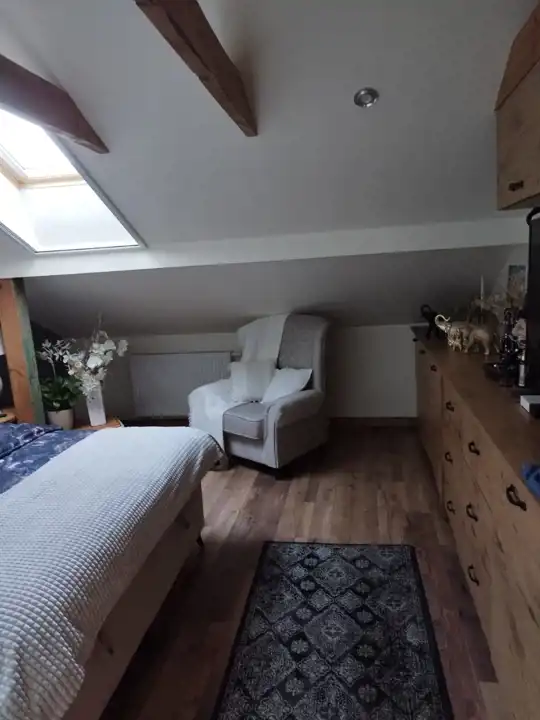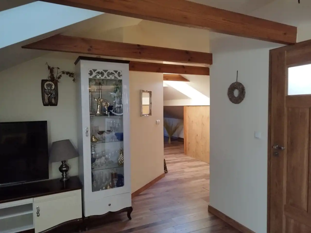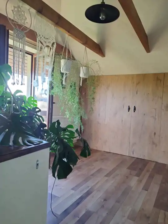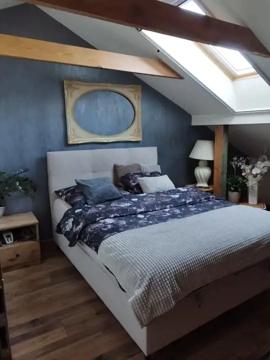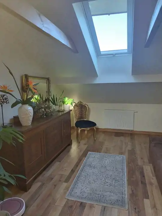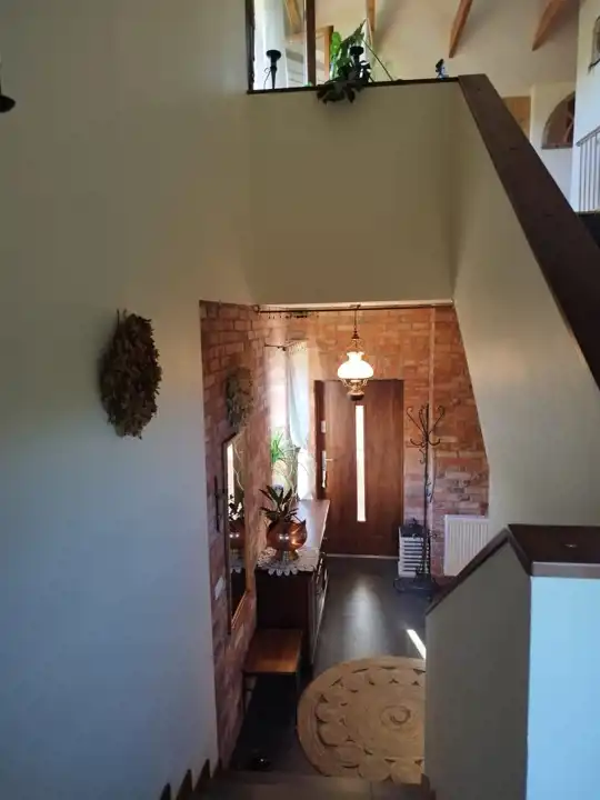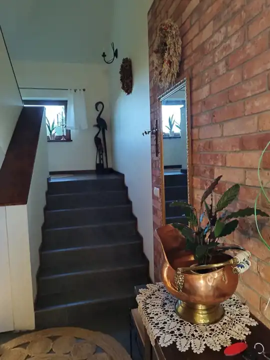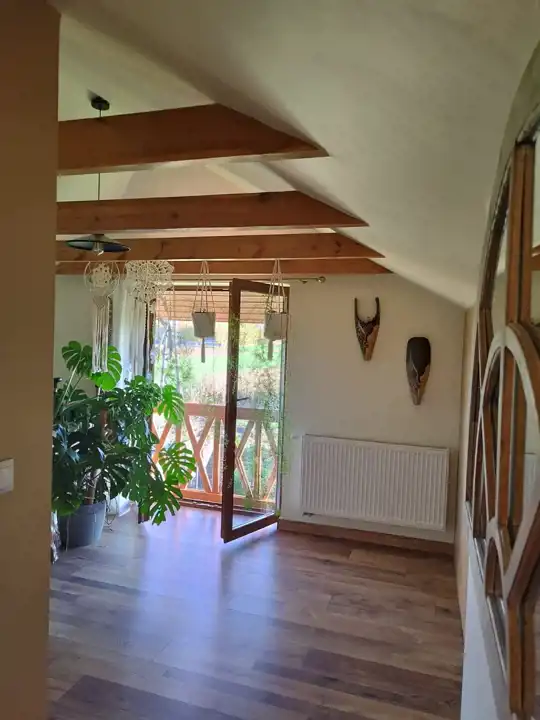 Mieszkanie na poddaszu z oddzielnym wejściem /100 m2/ można zaaranżować na dodatkowe pokoje i uzyskać więcej miejsc noclegowych.