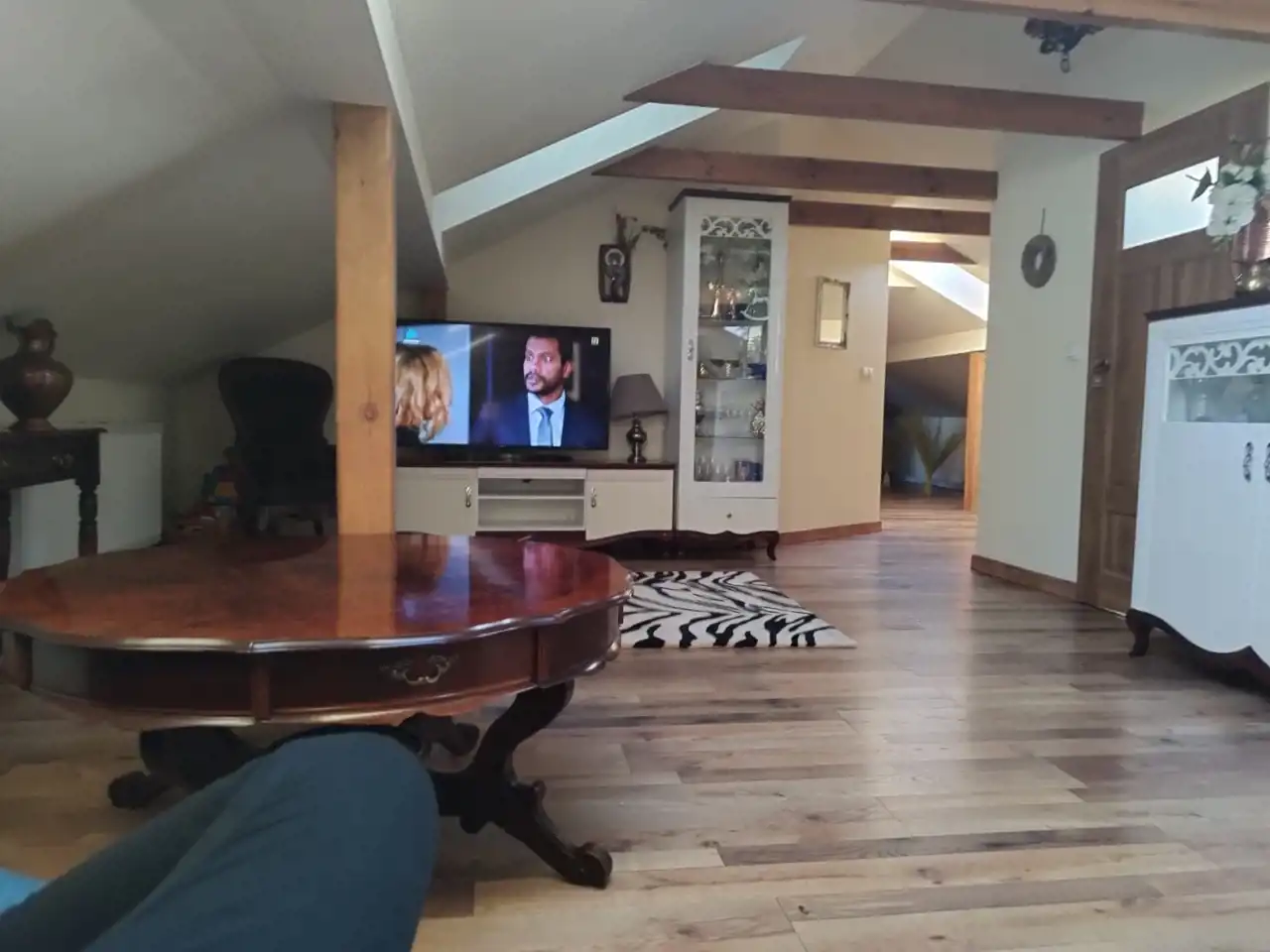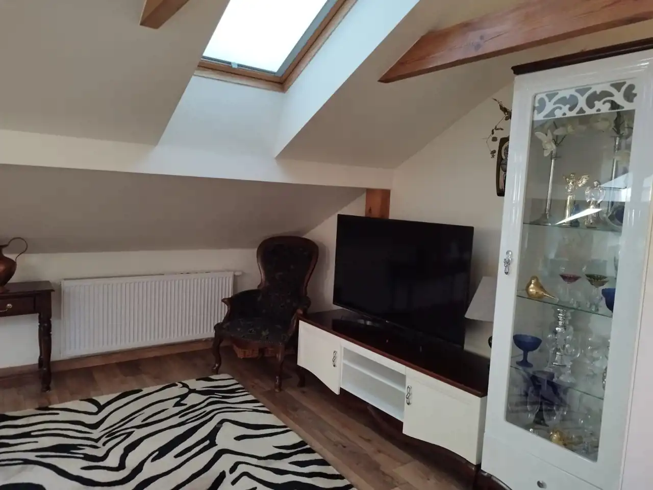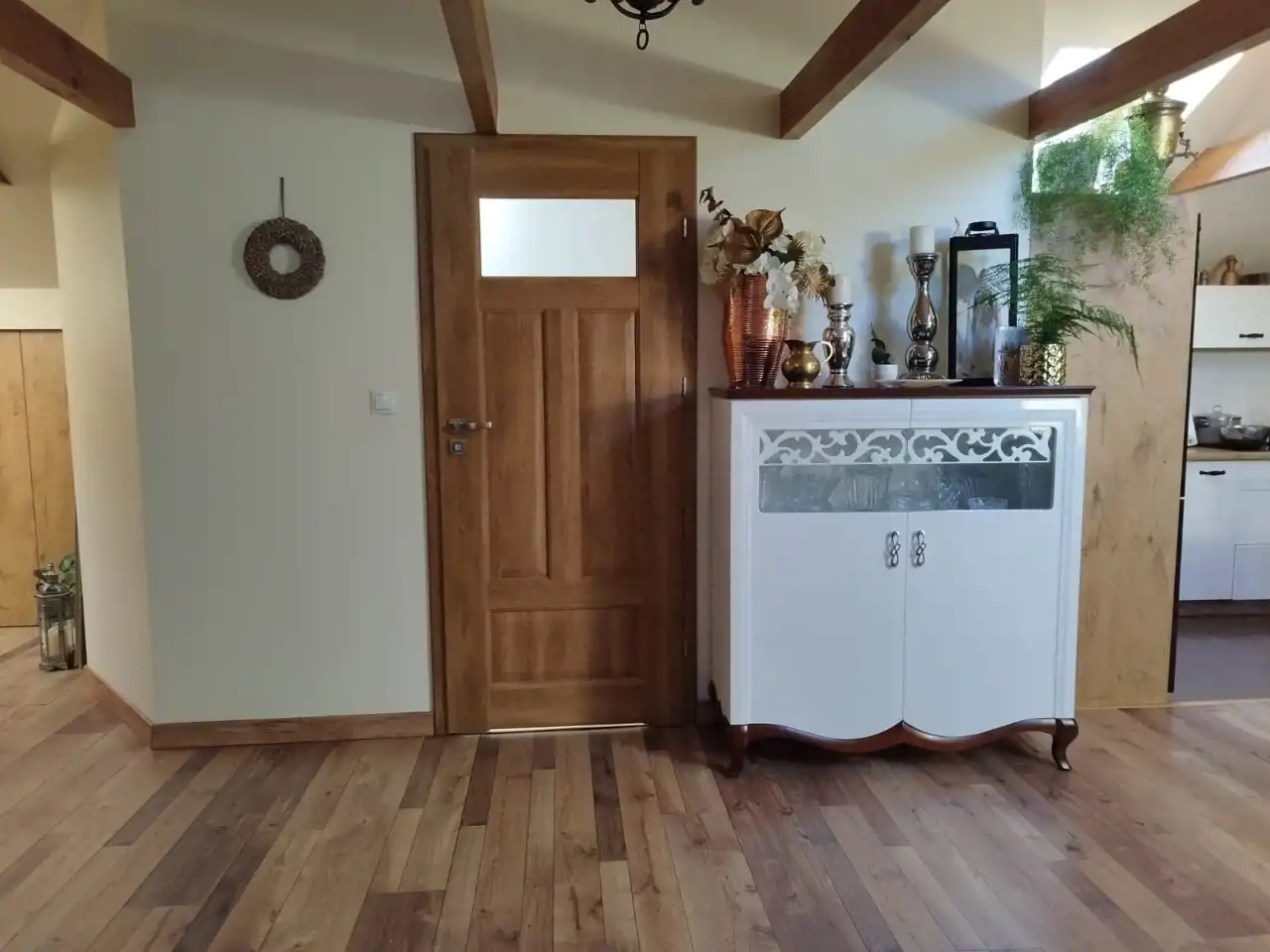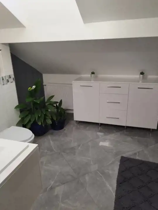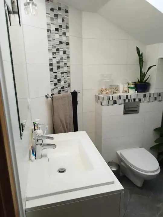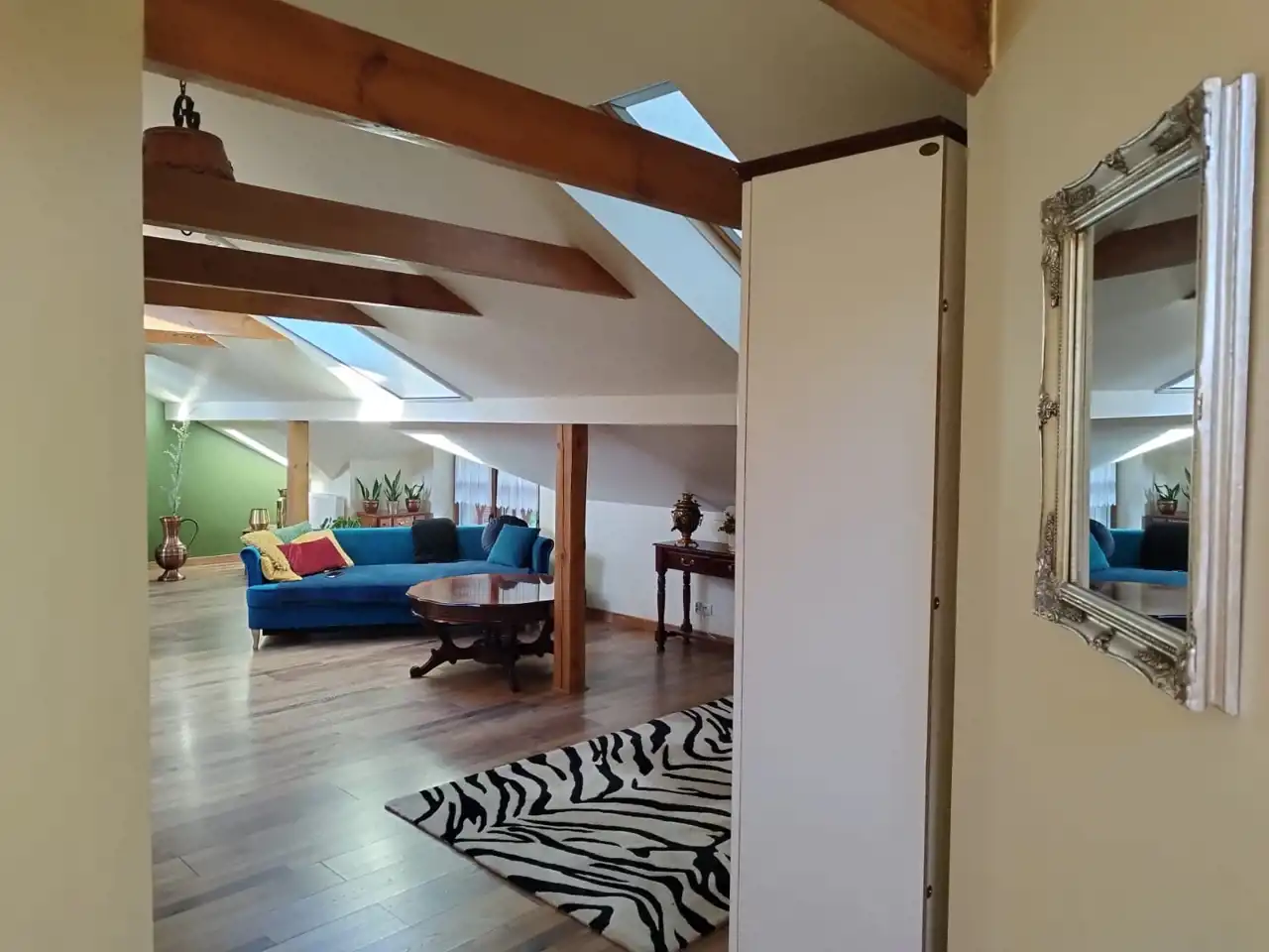 Mieszkanie na poddaszu z oddzielnym wejściem /100 m2/ można zaaranżować na dodatkowe pokoje i uzyskać więcej miejsc noclegowych.