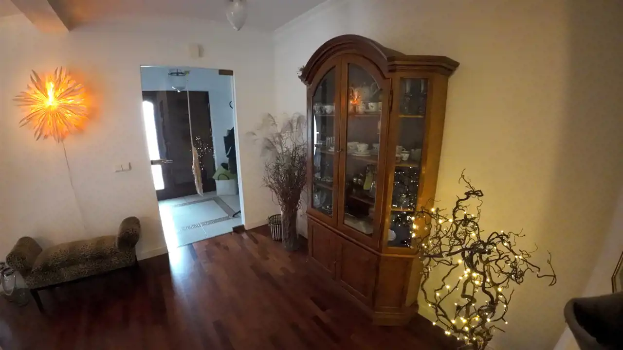 Nieruchomość składa się z: salonu połączonego z aneksem kuchennym, pomieszczenia gospodarczego, dwóch sypialni (z czego jedna z prywatną łazienką oraz wejściem do sauny), garderoby, dwóch łazienek połączonych z WC, sauny, korytarza, wiatrołapu oraz garażu. Dom posiada ogrzewanie podłogowe gazowe, na dachu zainstalowane kolektory słoneczne. Woda podgrzewana jest za pomocą pieca gazowego. Dodatkowo w salonie znajduję się kominek.