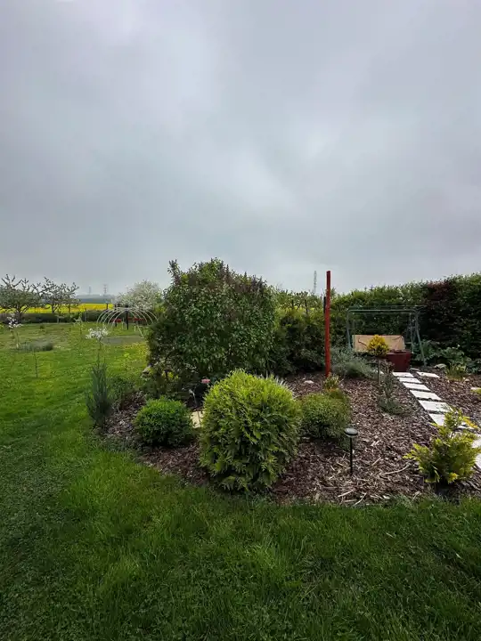 Dom znajduje się na ogrodzonej działce o powierzchni 781 m², która została starannie zagospodarowana – nasadzenia z tuj i roślin ozdobnych tworzą klimat prywatnego ogrodu botanicznego.